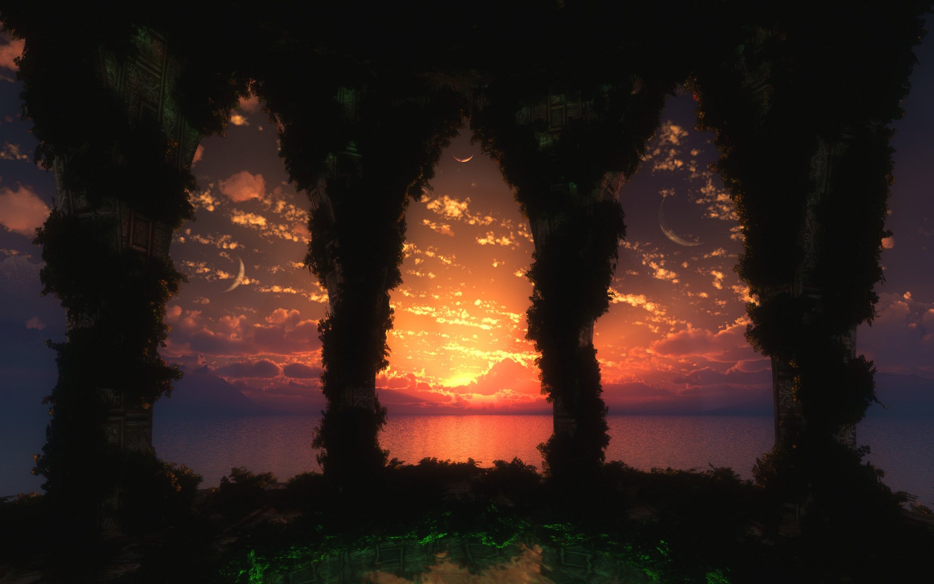 Coucher de soleil sur la mer près de quatuor des arbres