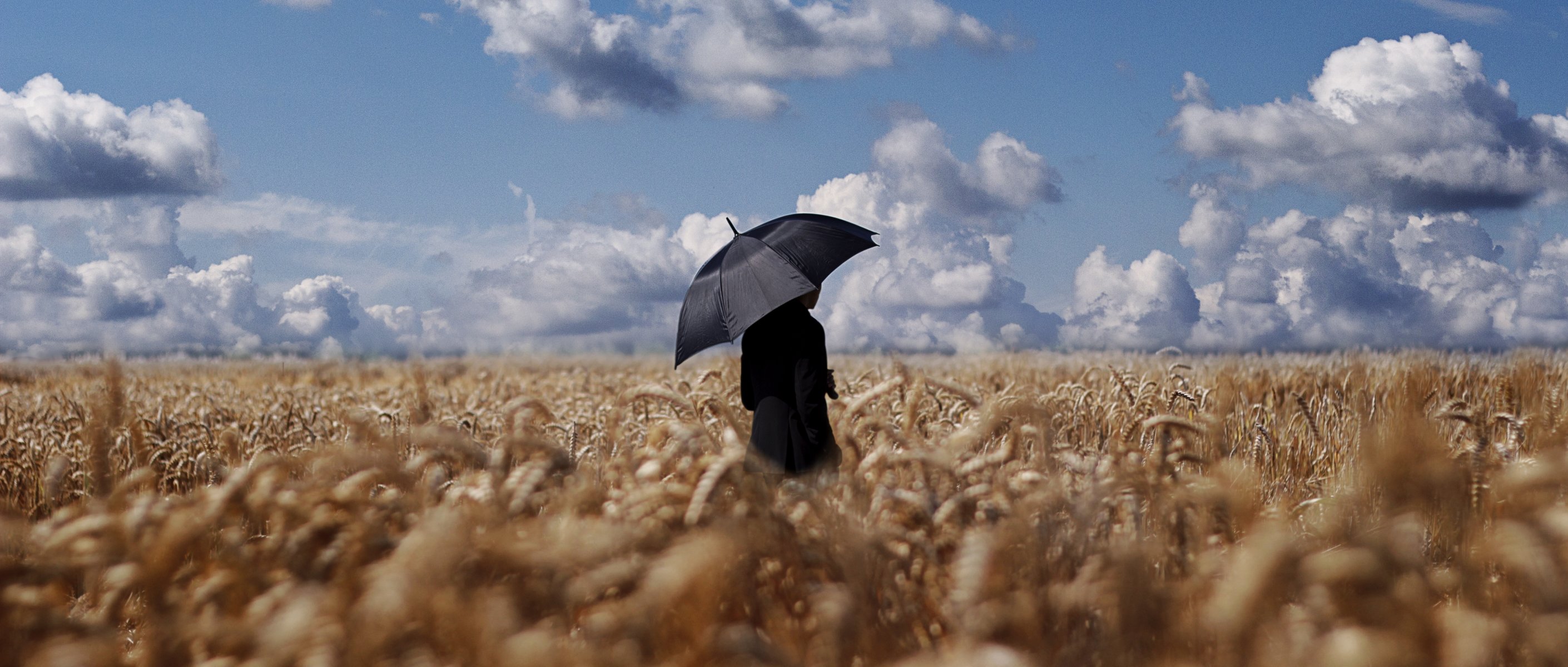 Sur le champ de blé d'un homme avec un parapluie noirSur le champ de blé d'un homme avec un parapluie noir