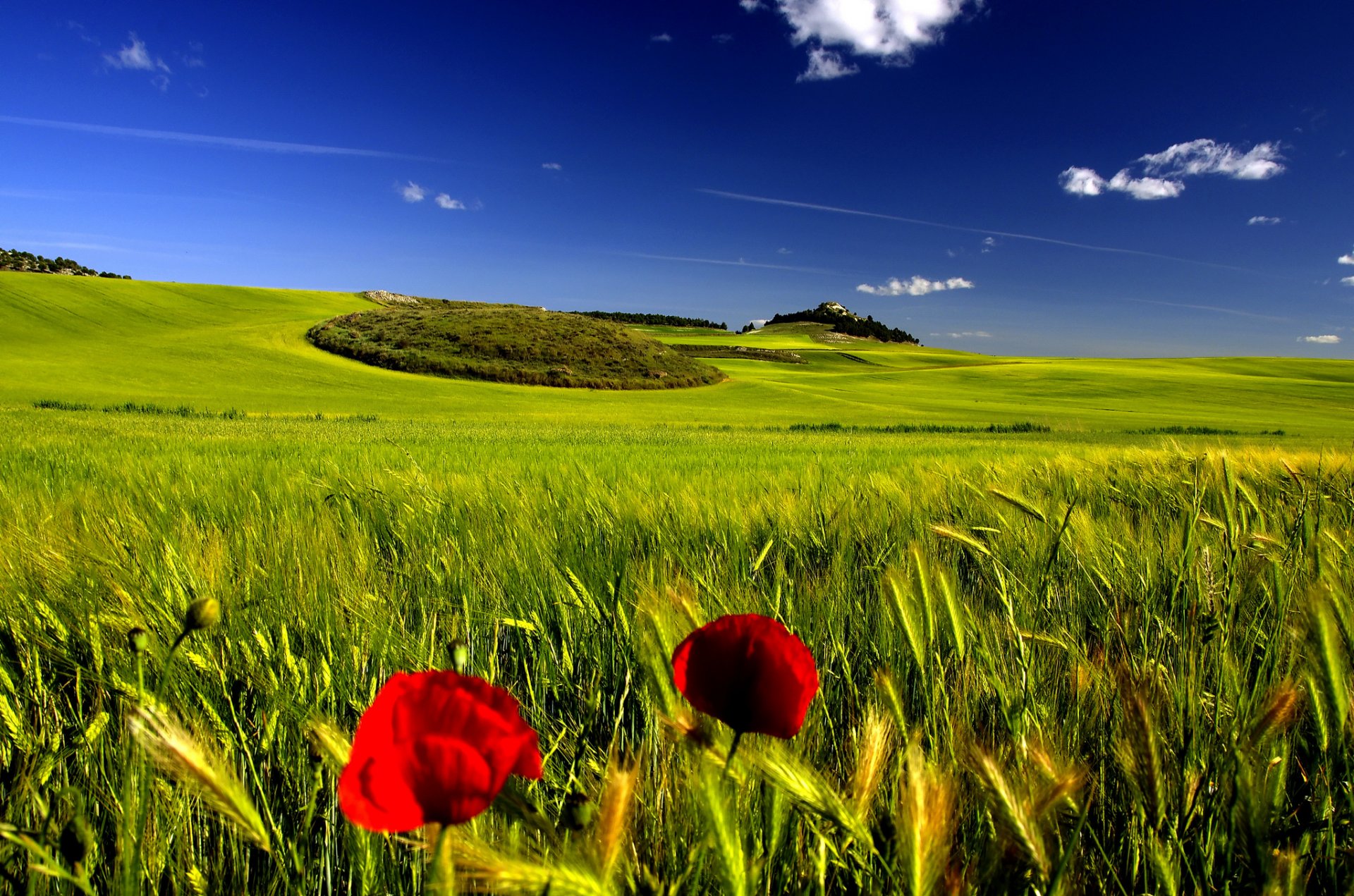 Champ vert couvert d'herbe basse avec vue sur la collineChamp vert couvert d'herbe basse avec vue sur la colline