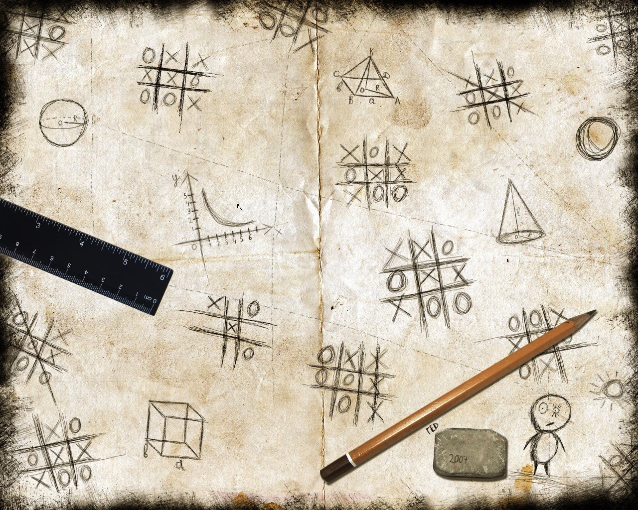 Papier avec une image du jeu TIC-tac-Toe, il y a un crayon, une règle et une râpe