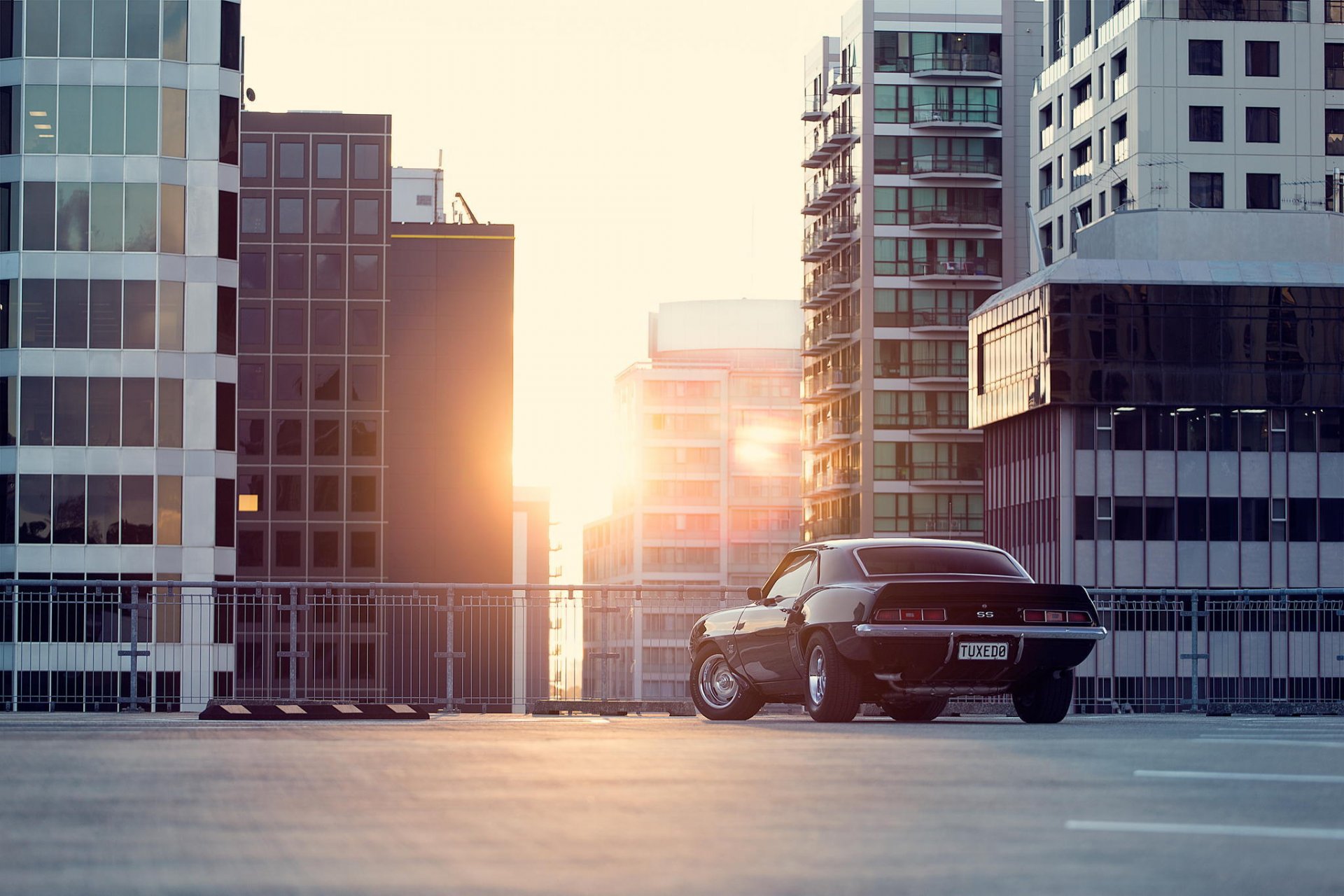 Chevrolet Camaro sur fond de coucher de soleil au milieu du développement urbain