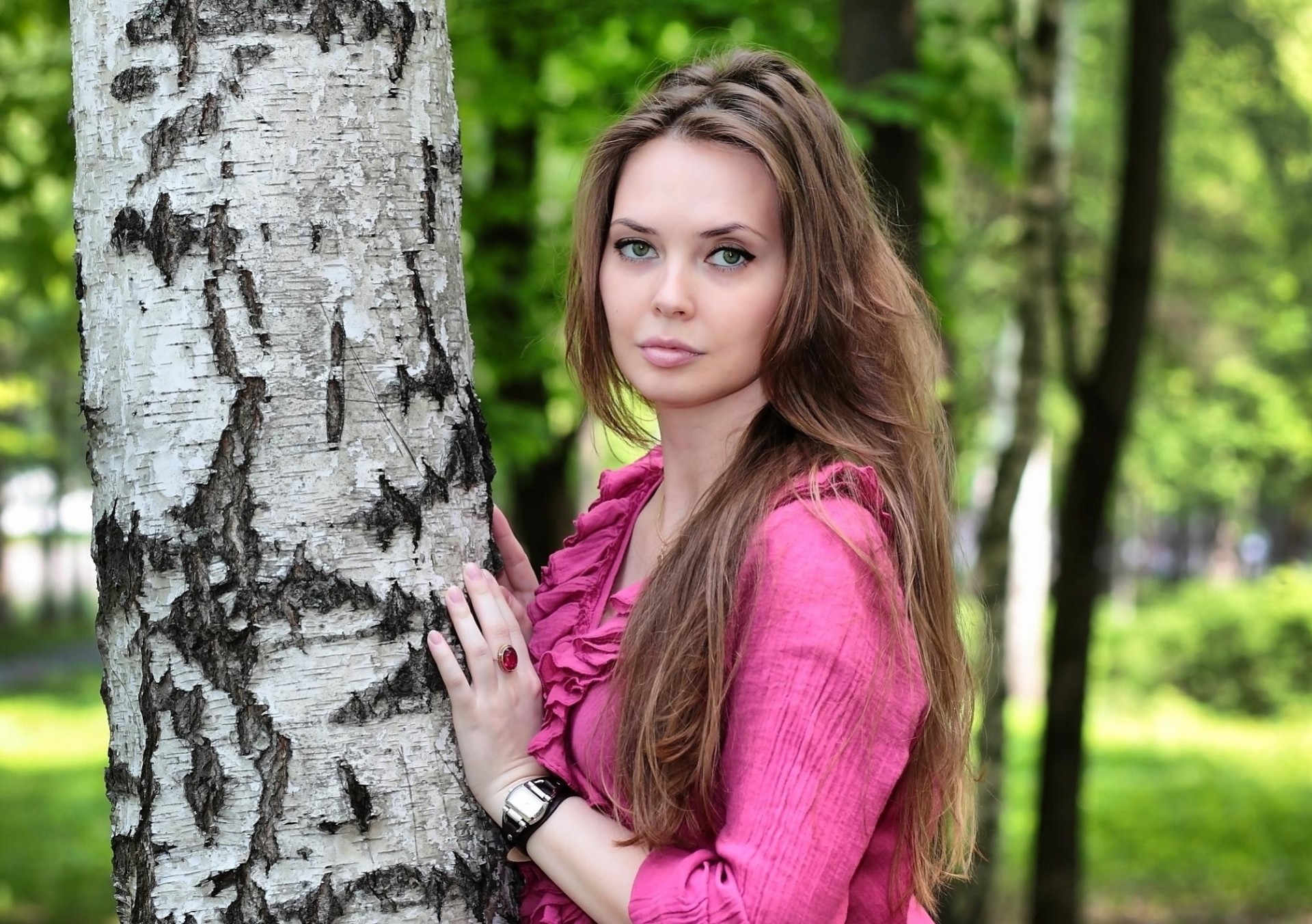 Brune salope aux cheveux longs se promène dans les bois dans une tenue candide