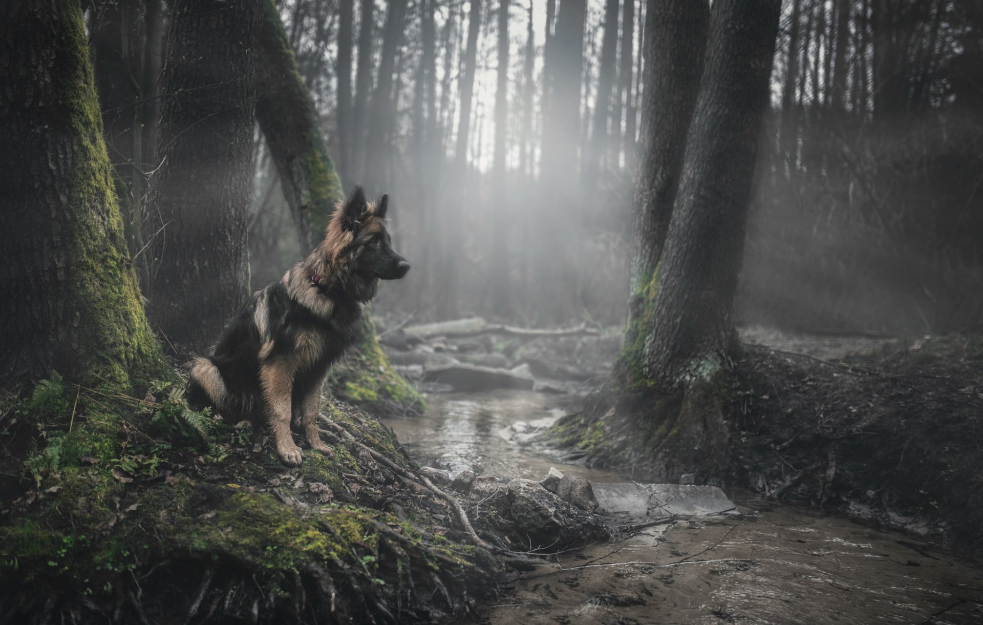Beau berger dans la forêt brumeuse avec les rayons du soleilBeau berger dans la forêt brumeuse avec les rayons du soleil