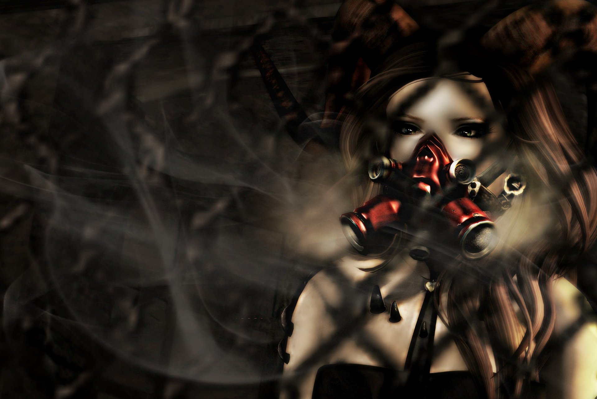 La jeune fille dans un masque à gaz avec de longs cheveux