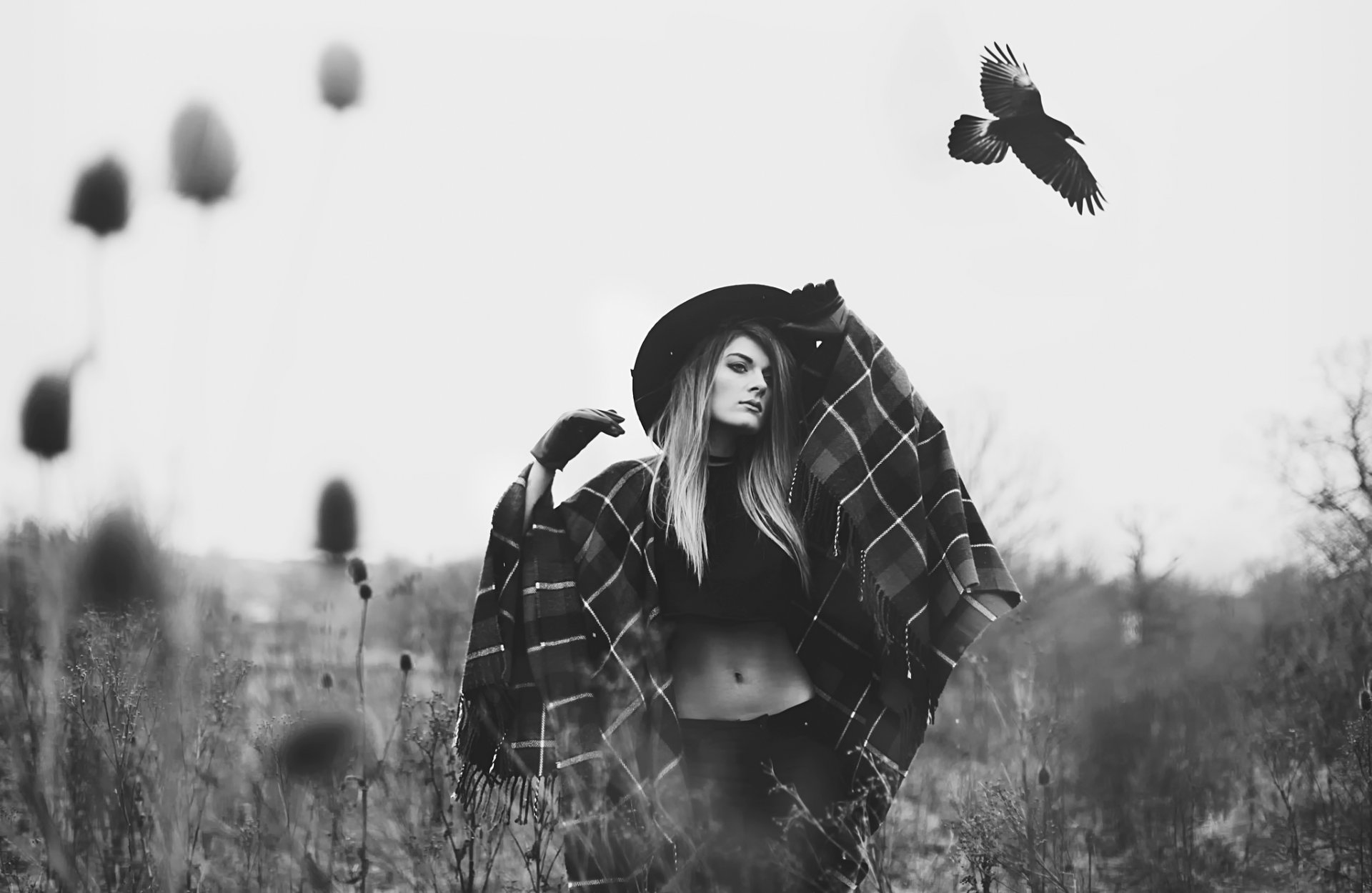 Portrait d'art d'une jeune fille aux yeux jaunes et les cheveux noirs avec un corbeau sur l'épaule sur fond sombre