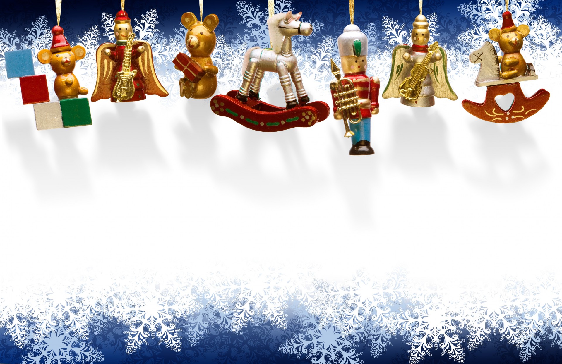 Jouets de Noël sous la forme de figurines d'animaux de couleur dorée dans la partie supérieure, fond blanc au milieu, haut et bas sur fond bleu flocons de neige blancs