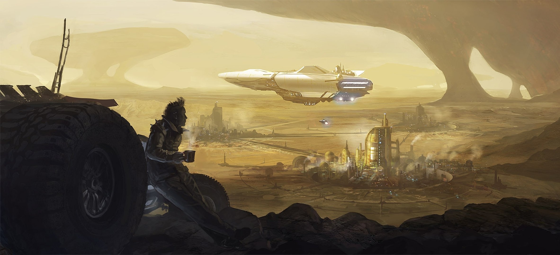 Guy boit du café sur le fond du désert et de la ville de l'espace