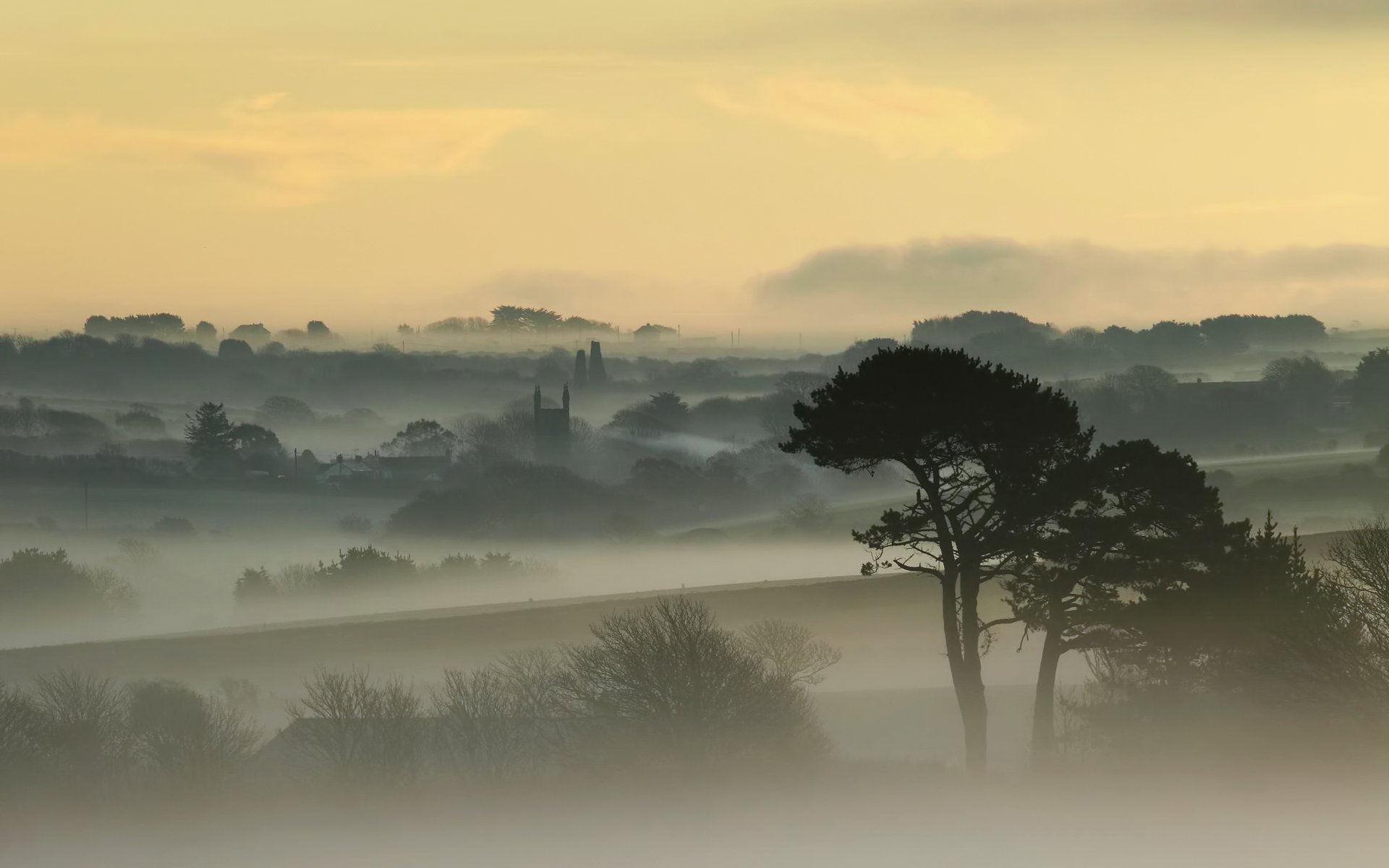 Vallée du matin dans le brouillard. Une rivière étroite coule