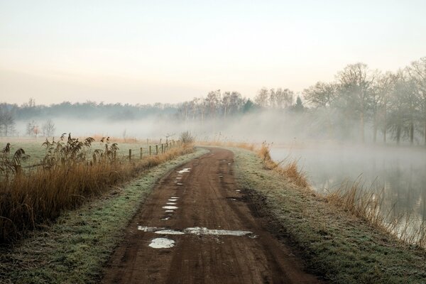 Route dans le brouillard au bord de la rivière