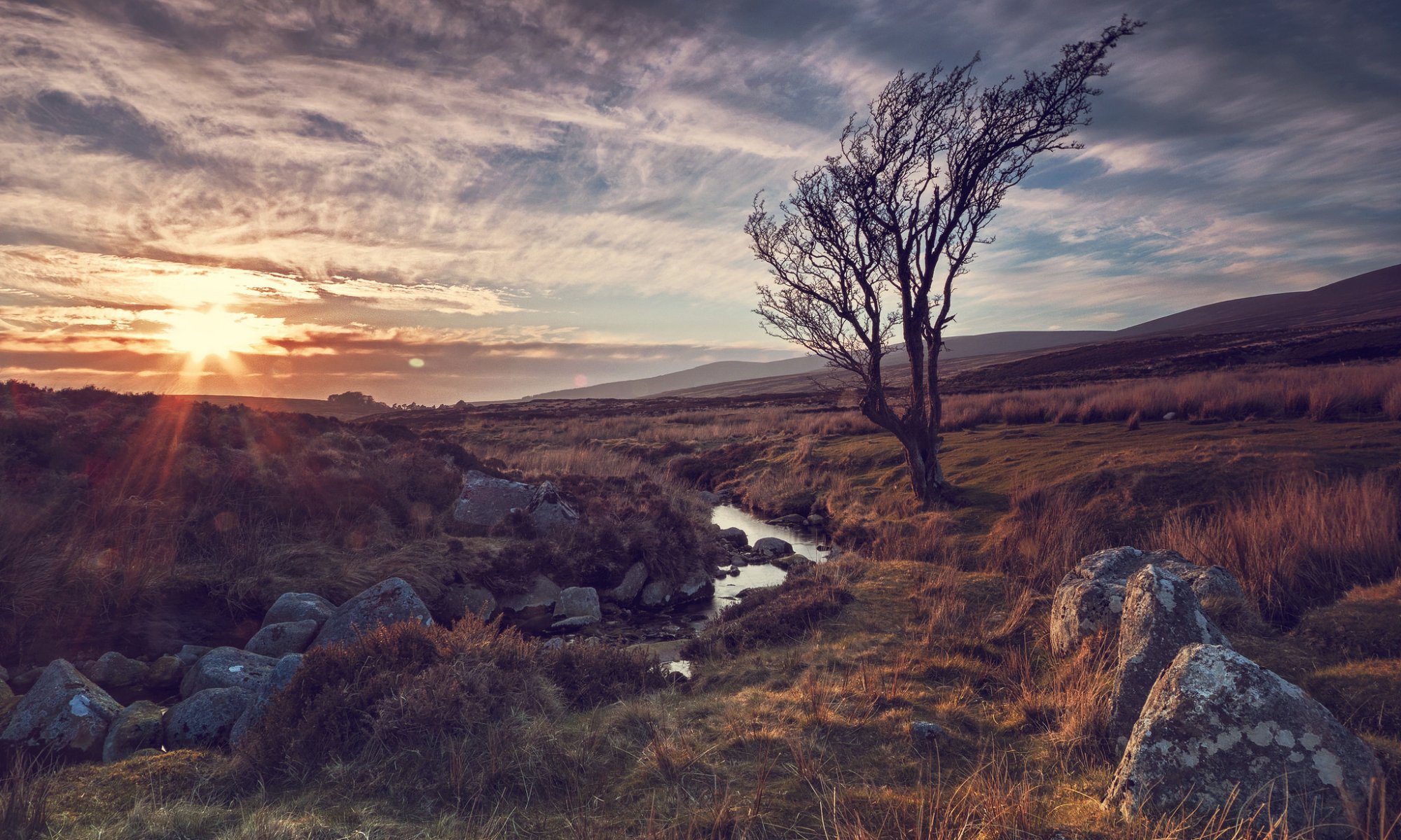 Pierres de la nature dans les rayons du soleil au coucher du soleil et la rivière