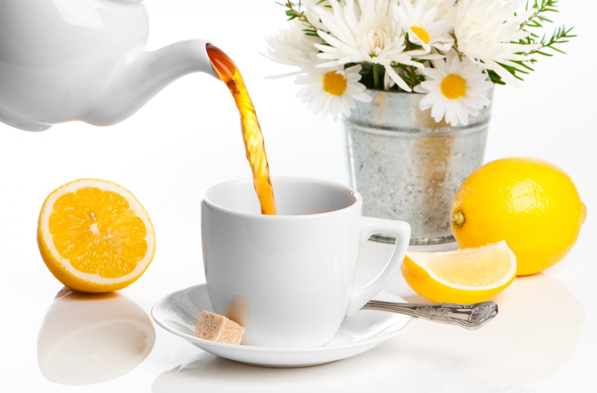 Thé au citron sur fond de seau avec des margueritesThé au citron sur fond de seau avec des marguerites