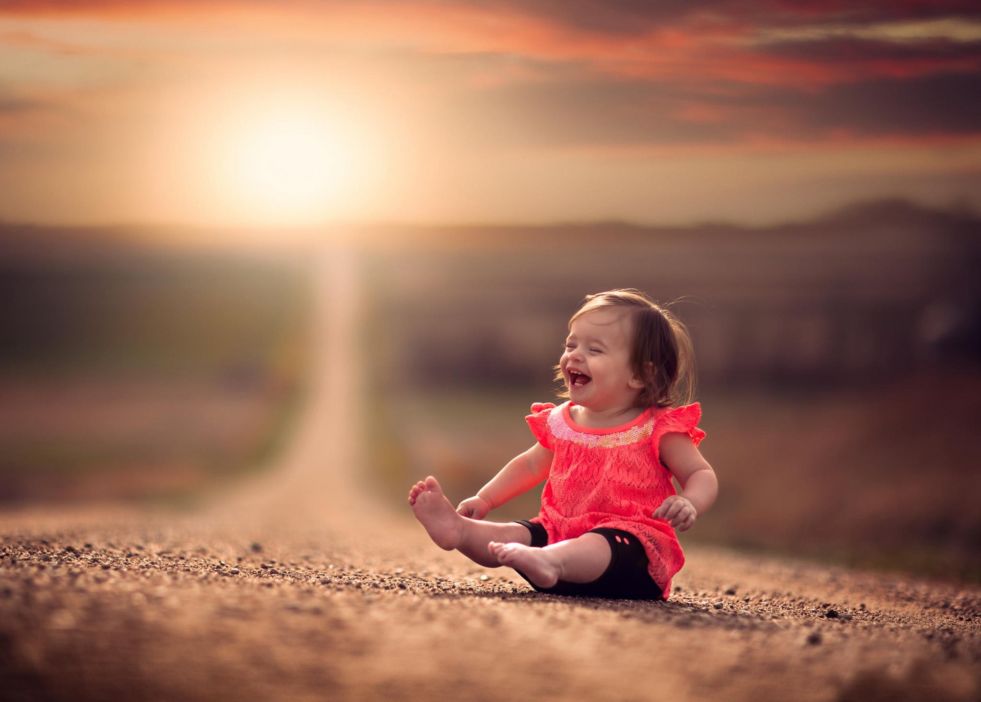 Petite fille assise sur la route dans la lumière du coucher du soleil