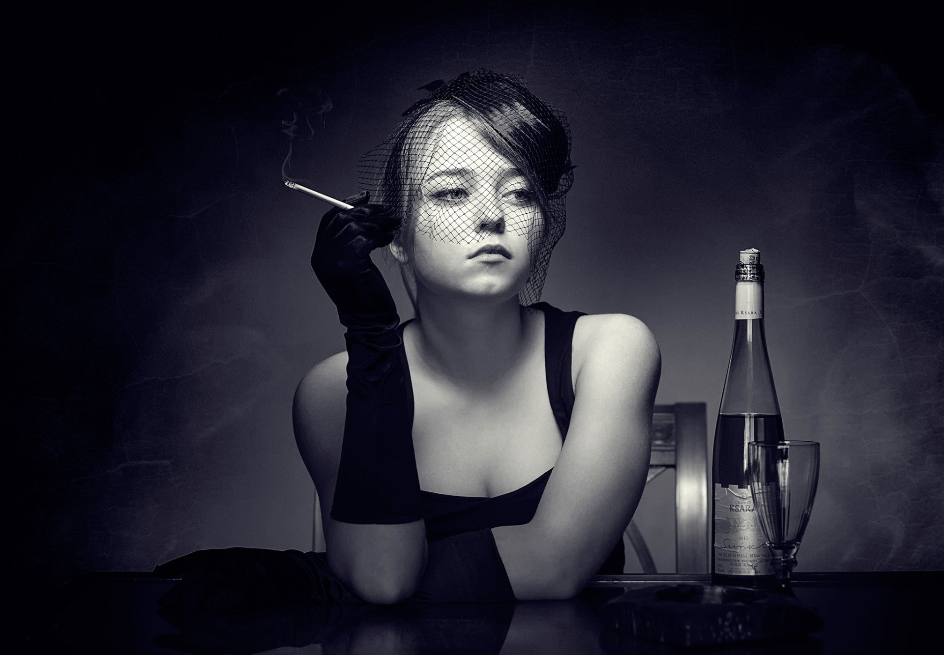 Veuve en noir avec une cigarette et une bouteille en voile