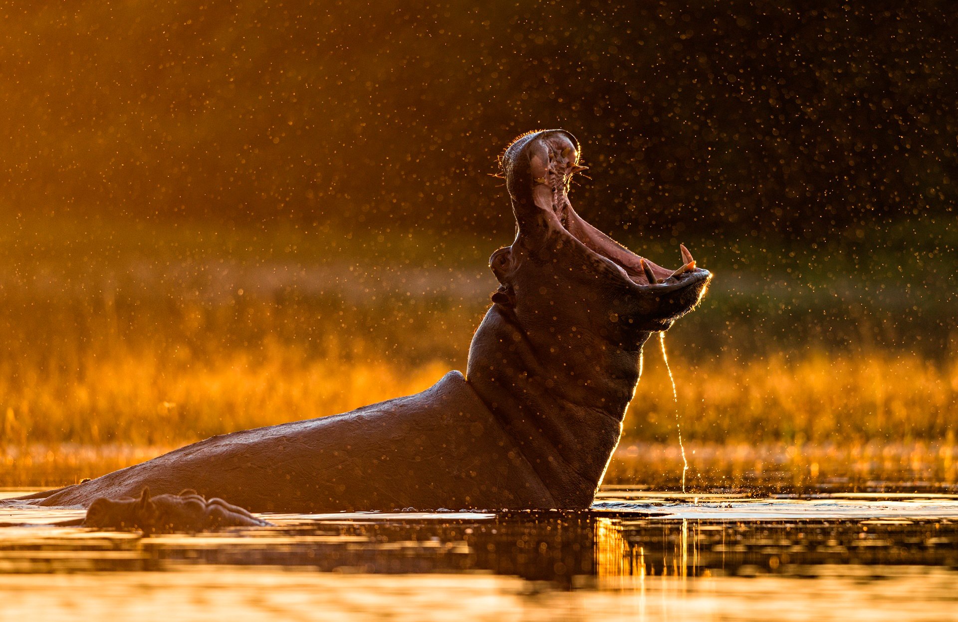 Hippopotame dans la rivière avec la bouche ouverteHippopotame dans la rivière avec la bouche ouverte