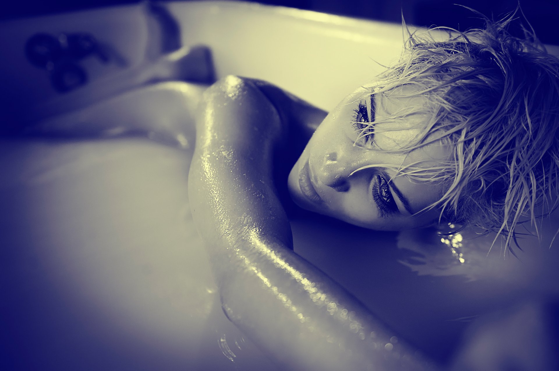 Dre Davis dans la salle de bain sur une vieille photo incolore