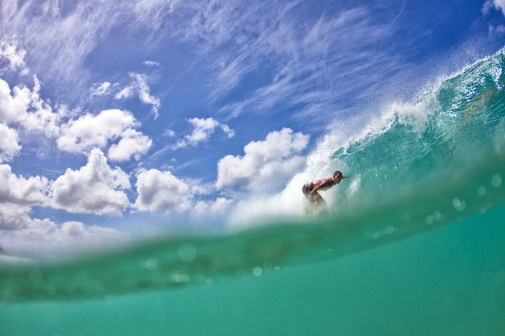 Surfeur sur la crête de la vague entre le ciel et l'eauSurfeur sur la crête de la vague entre le ciel et l'eau