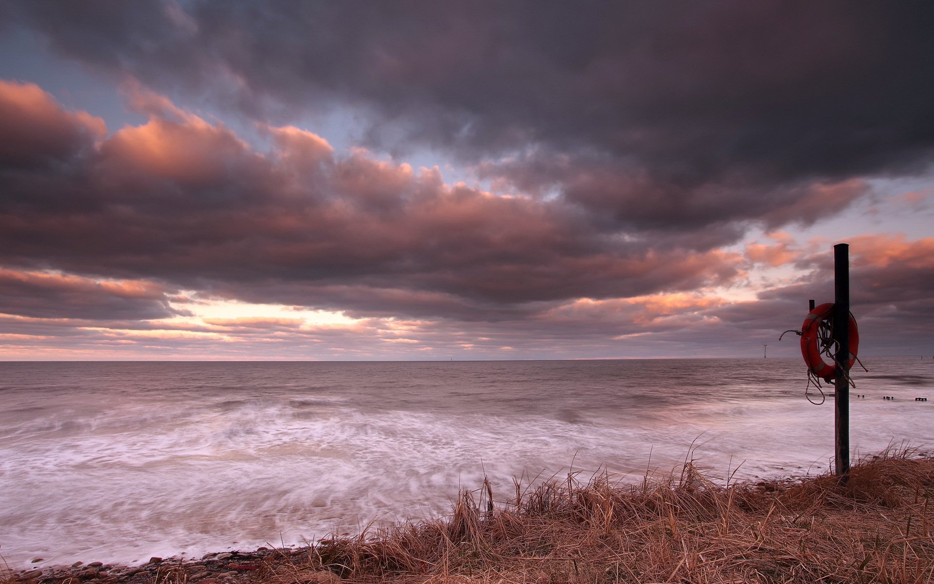 Bord de mer au coucher du soleil avec pilier et cercle de sauvetageBord de mer au coucher du soleil avec pilier et cercle de sauvetage