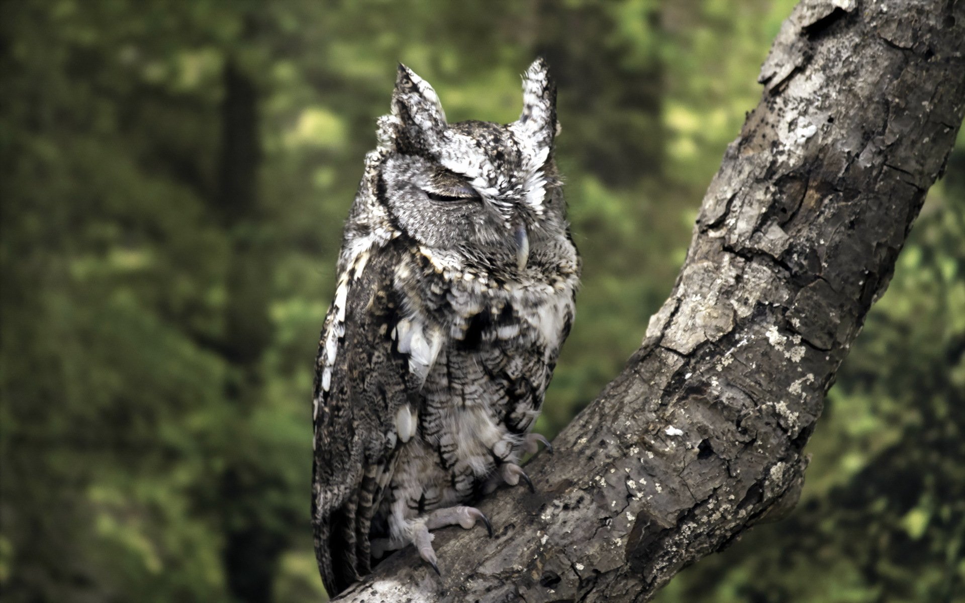 Panda endormi sur un tronc d'arbre entouré de branches et de feuillage vertPanda endormi sur un tronc d'arbre entouré de branches et de feuillage vert