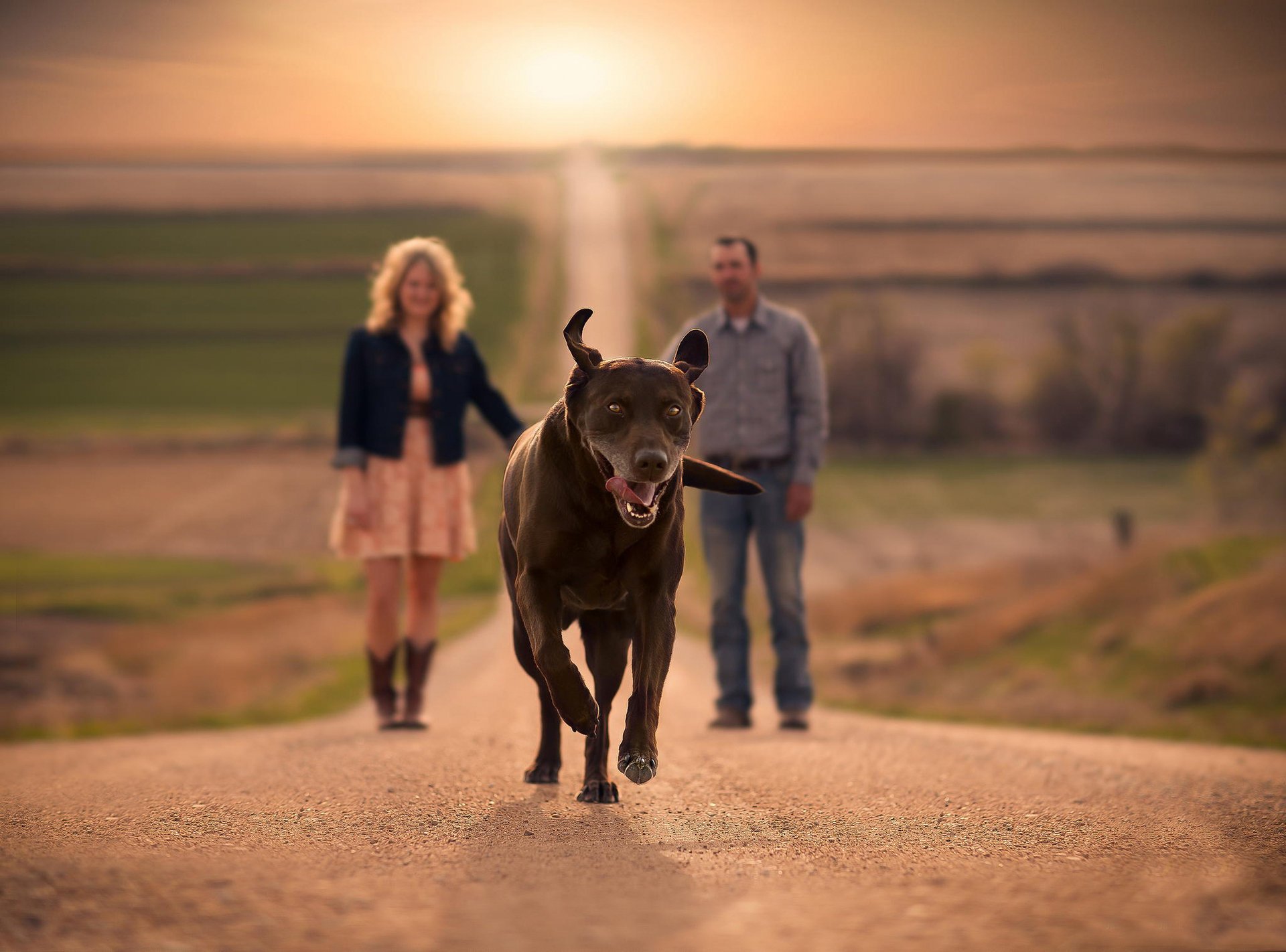 Chien en cours d'exécution joue avec les propriétairesChien en cours d'exécution joue avec les propriétaires