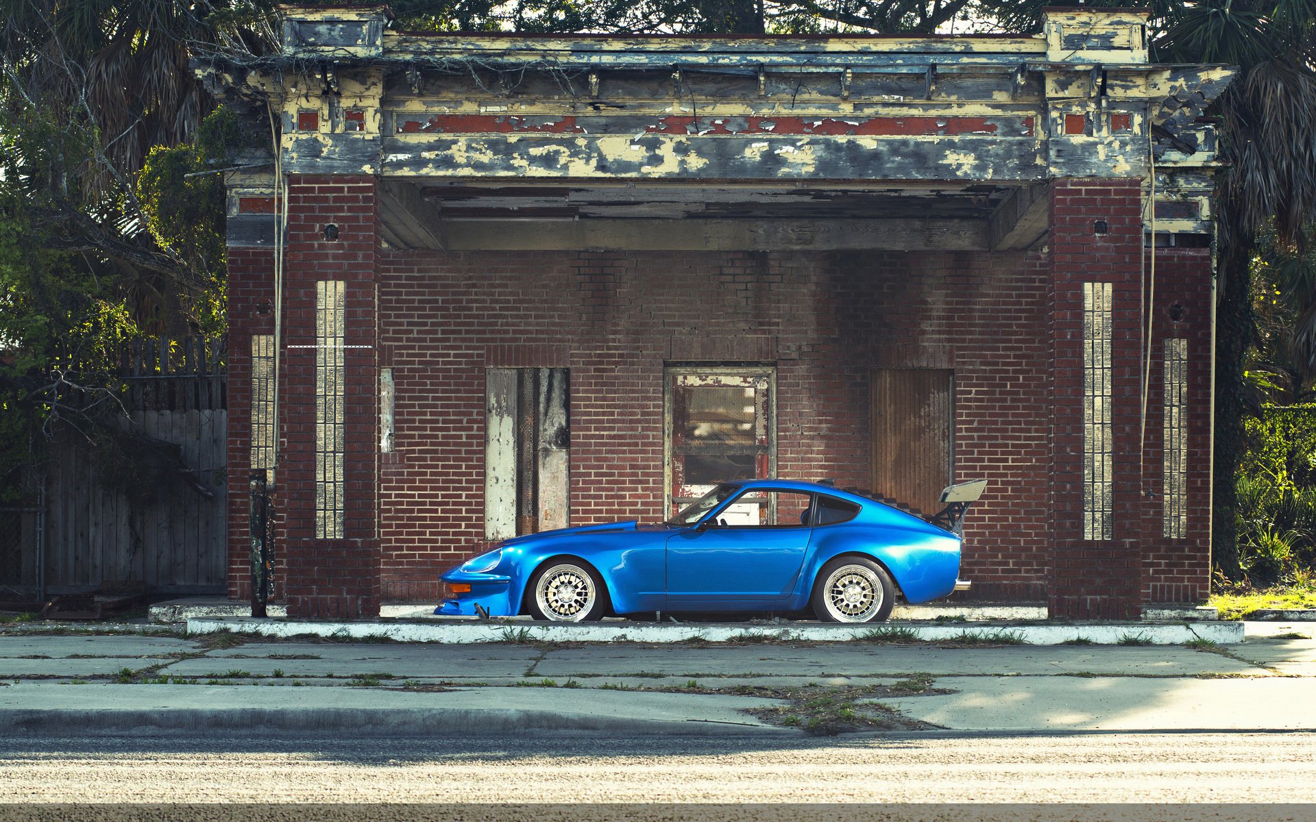 Chic bleu datsun 240z sur fond de maison abandonnée