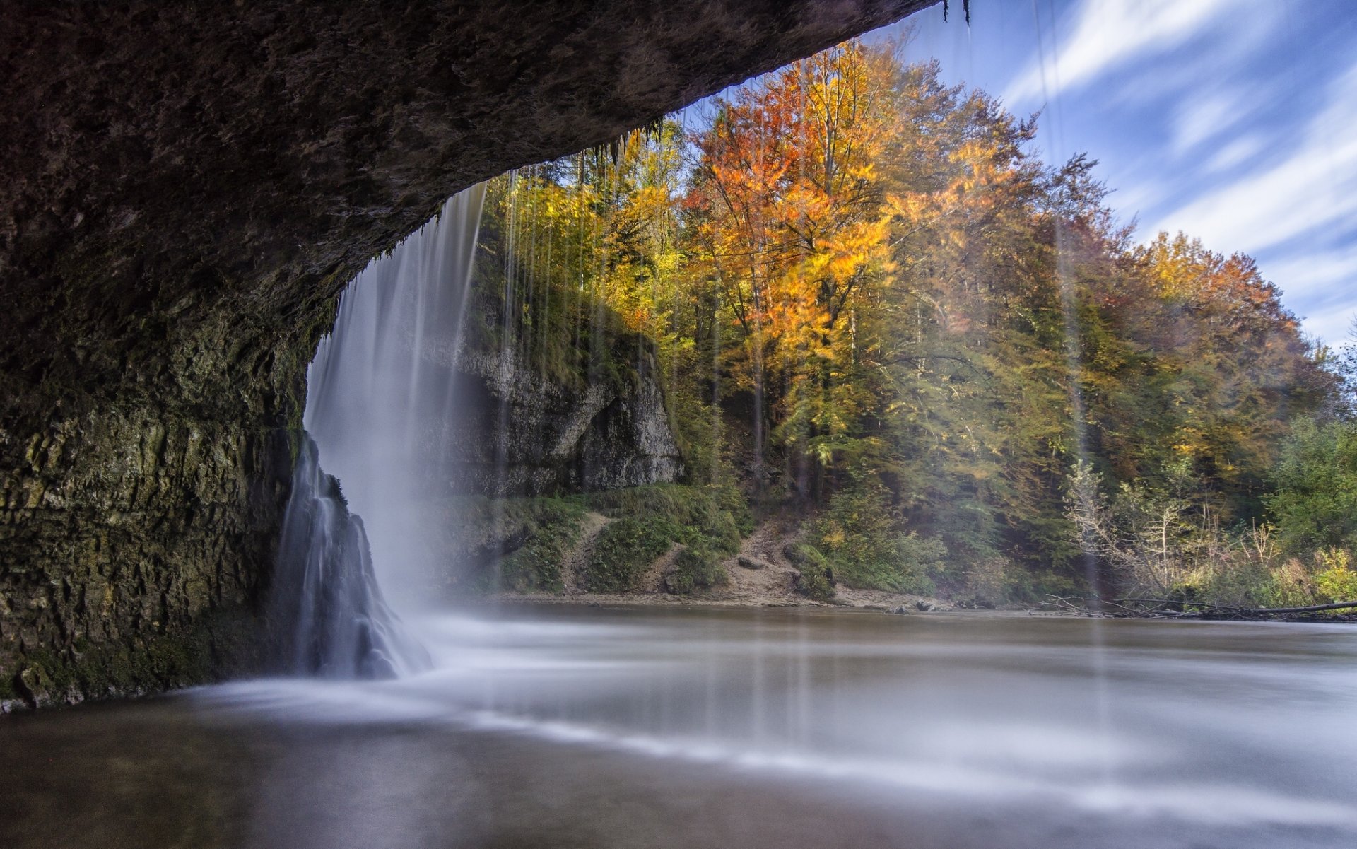 En automne, une chute d'eau tombe d'une falaise dans le lacEn automne, une chute d'eau tombe d'une falaise dans le lac