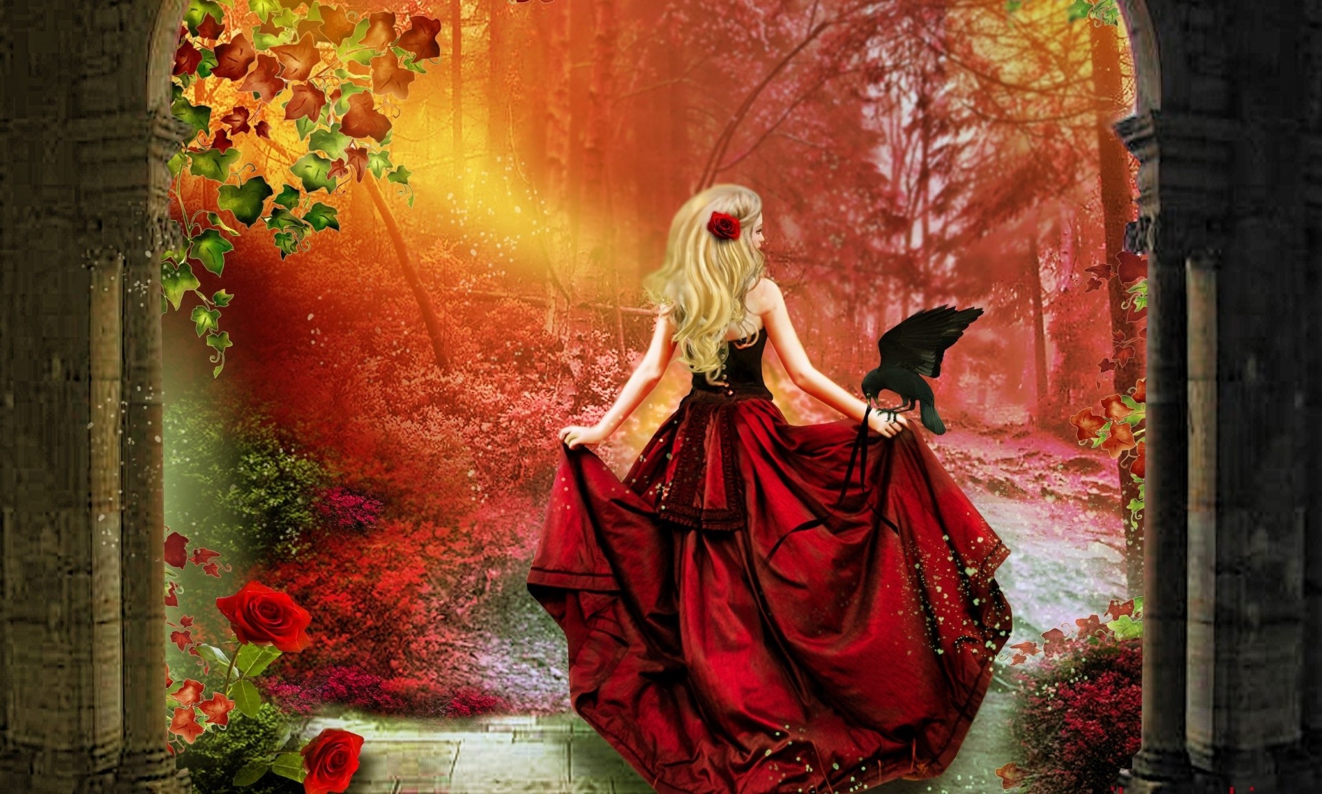 Fille sur un cheval chevauche les yeux fermés, sur la main d'un aigleFille sur un cheval chevauche les yeux fermés, sur la main d'un aigle