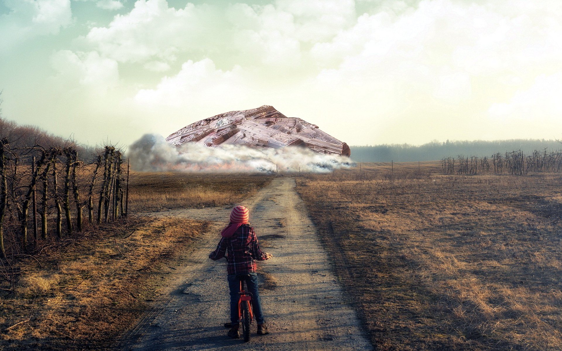 Une fille sur velisopede regardant un vaisseau extraterrestre tombé sur terre fantastiqueUne fille sur velisopede regardant un vaisseau extraterrestre tombé sur terre fantastique