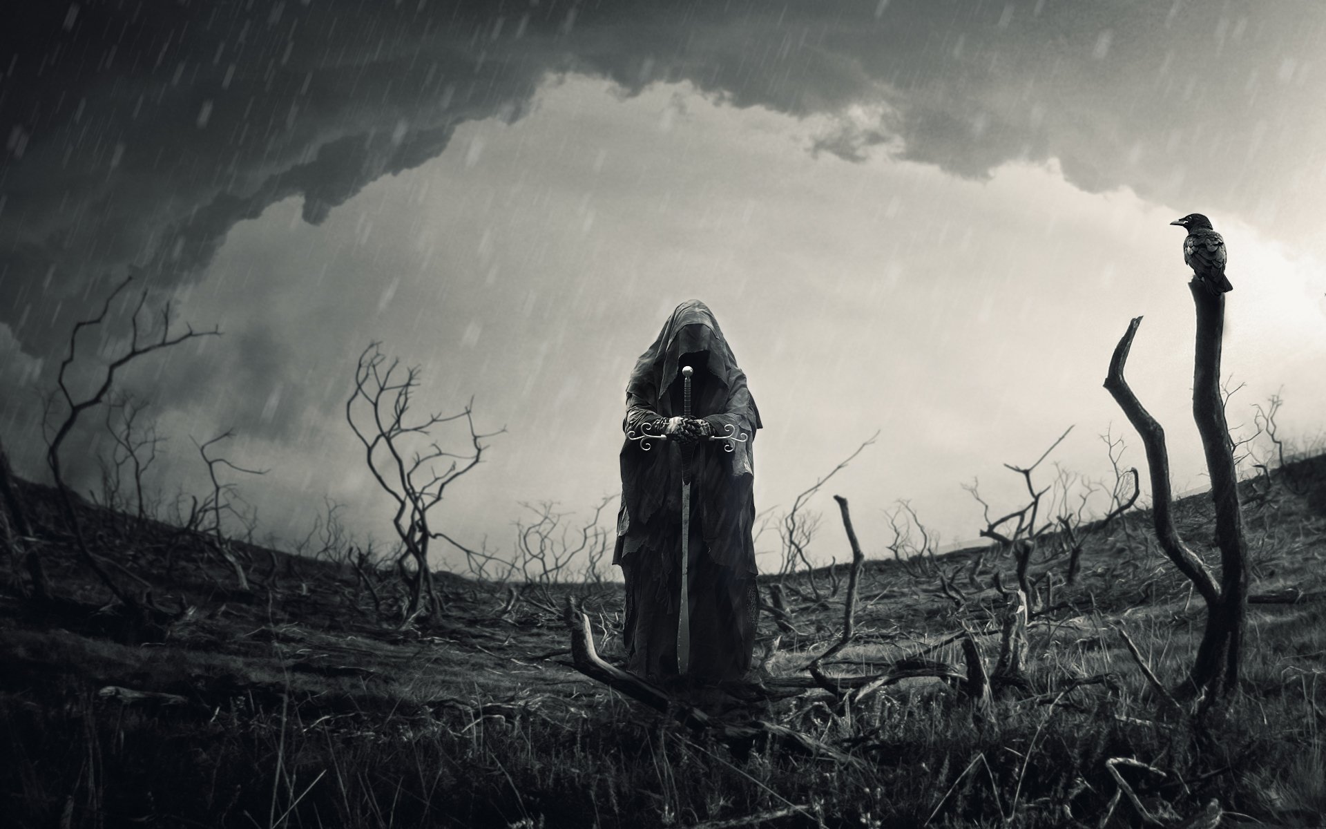 La jeune fille, un guerrier en armure avec un bâton sur le fond de ciel orange