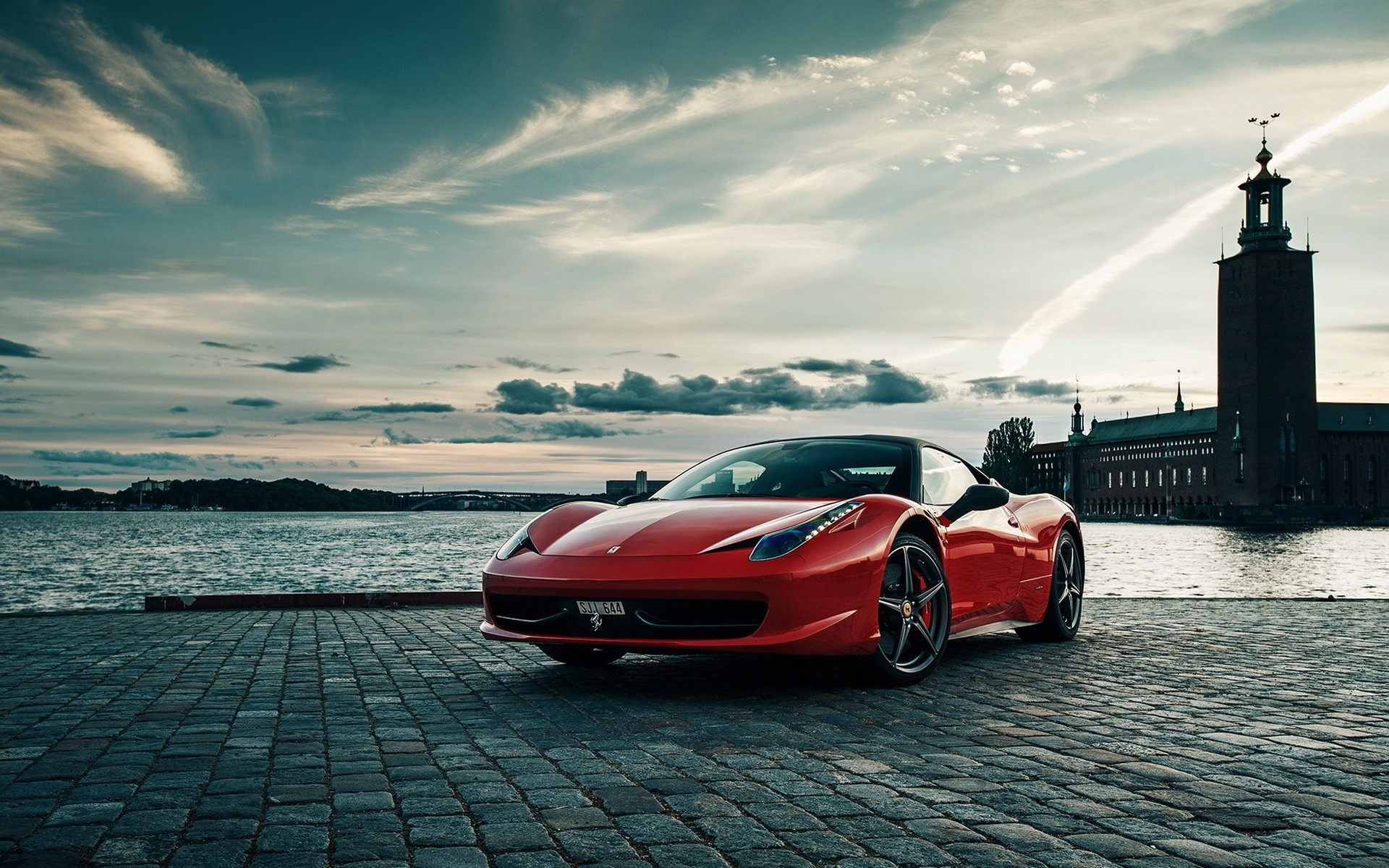 Ferrari spyder sur la route sur la route au milieu de l'herbeFerrari spyder sur la route sur la route au milieu de l'herbe