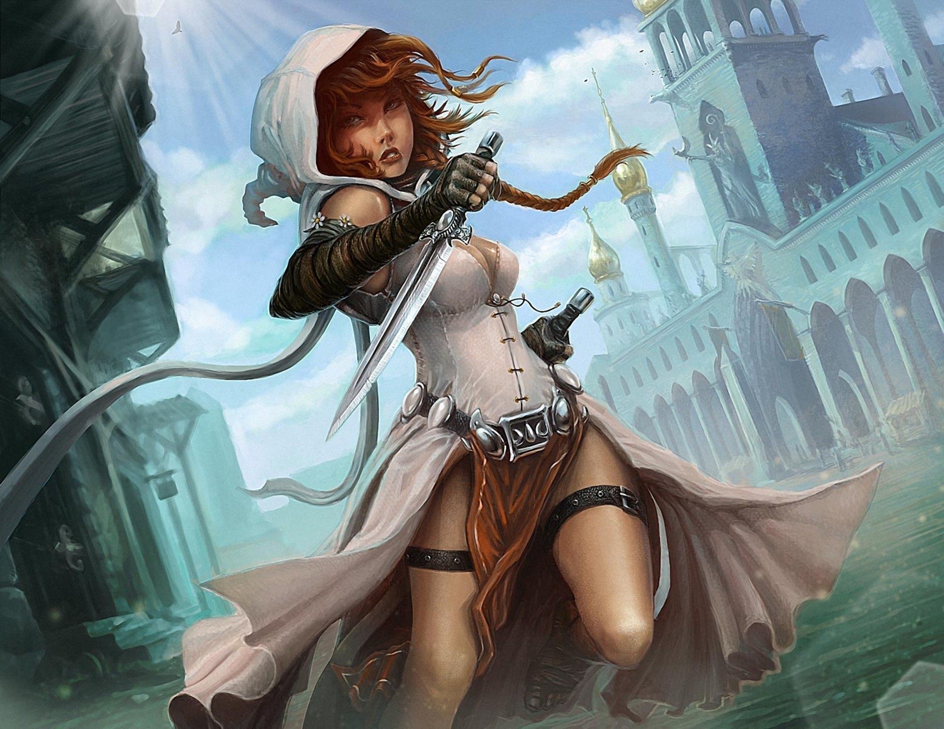 Fille avec un bouclier et une épée à la main avec un regard courageuxFille avec un bouclier et une épée à la main avec un regard courageux