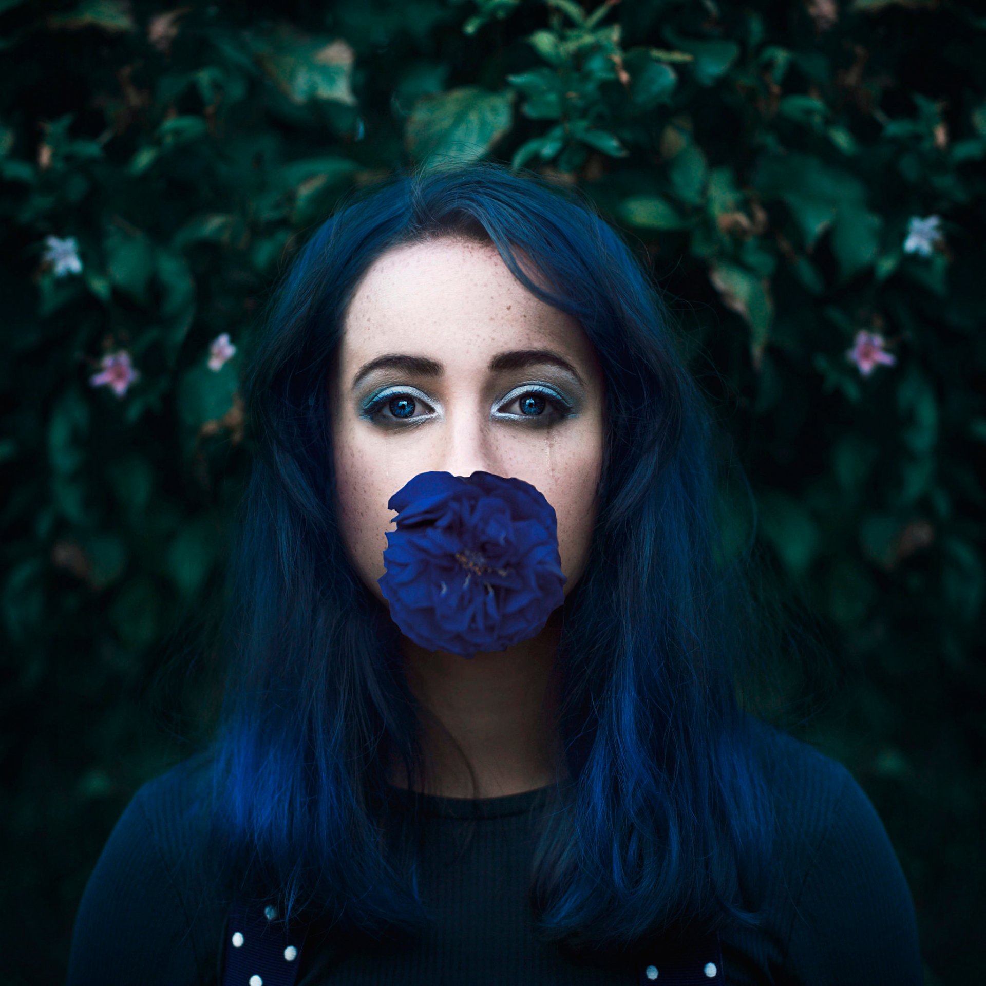 Fille dans les tons bleus tient les lèvres d'une fleur bleueFille dans les tons bleus tient les lèvres d'une fleur bleue