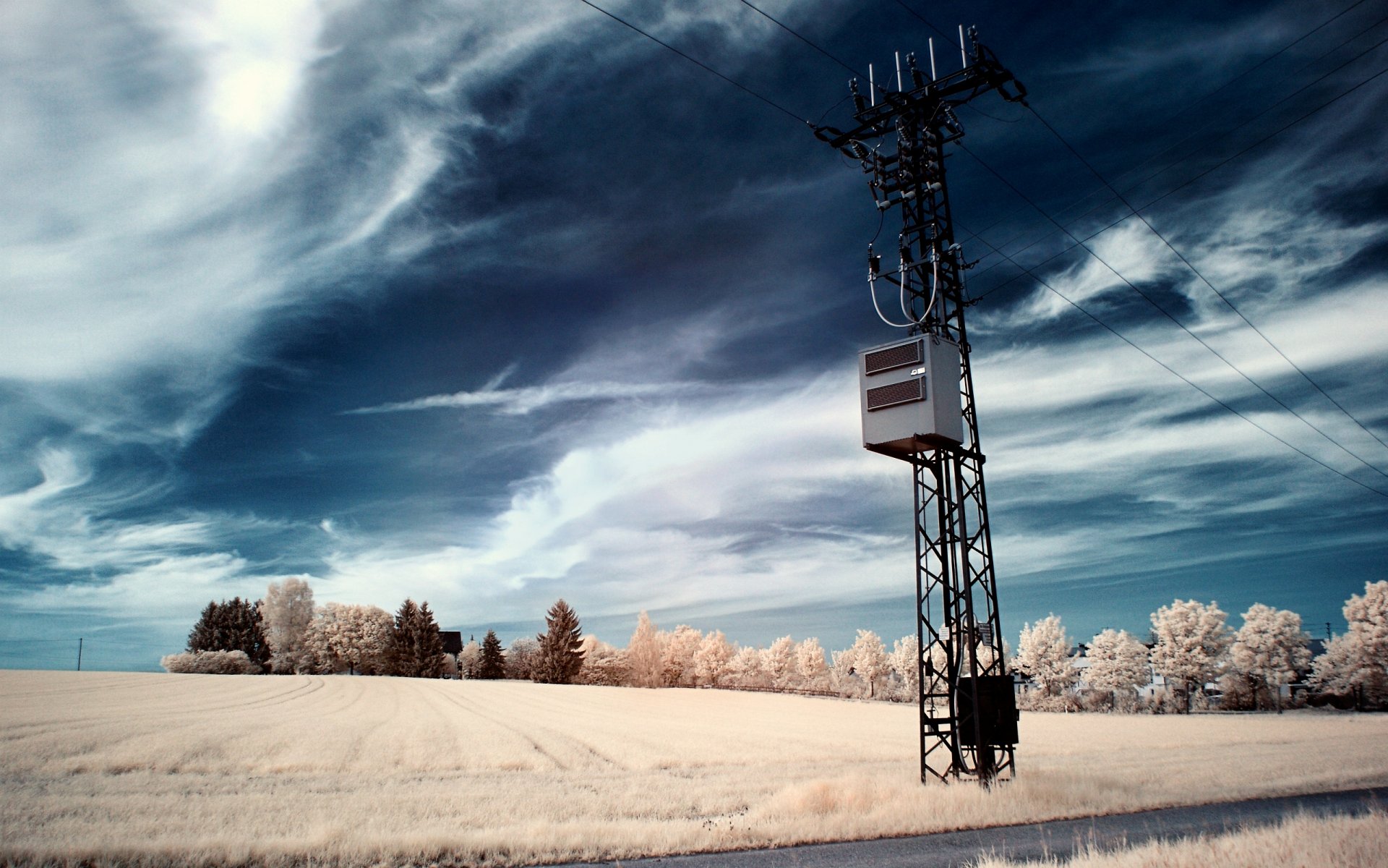 Pilier avec des fils électriques sur fond de ciel nuageux