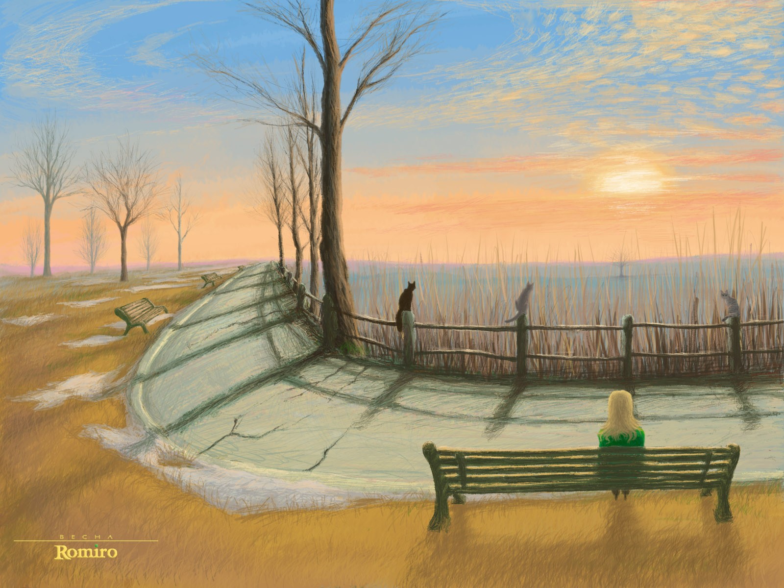 Jeune fille assise sur un banc dans les rayons du coucher du soleil