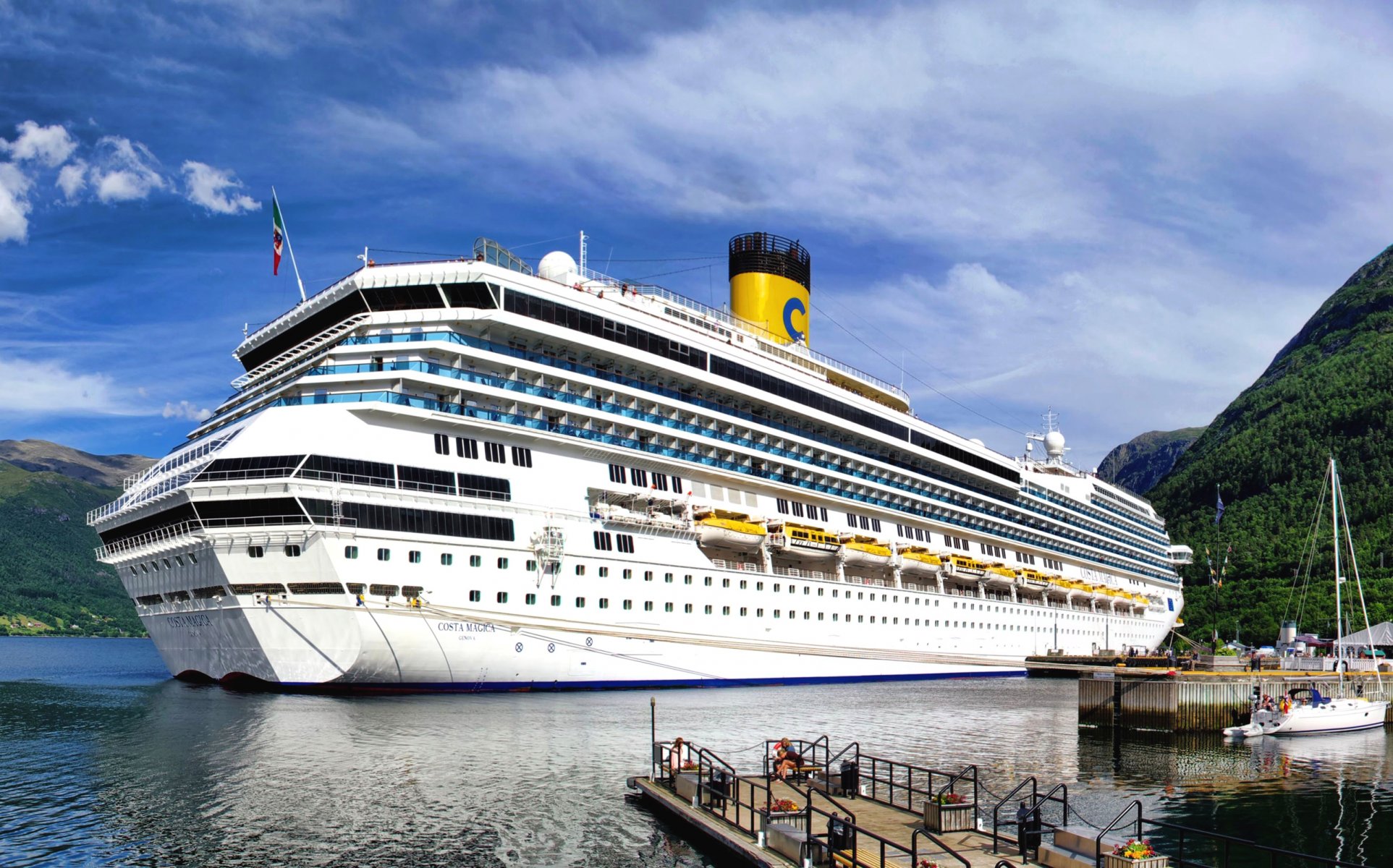Rivière de montagne en Norvège d'une beauté indescriptible avec de petites maisons dans les champs verts et avec des cascades qui se jettent dans la rivière