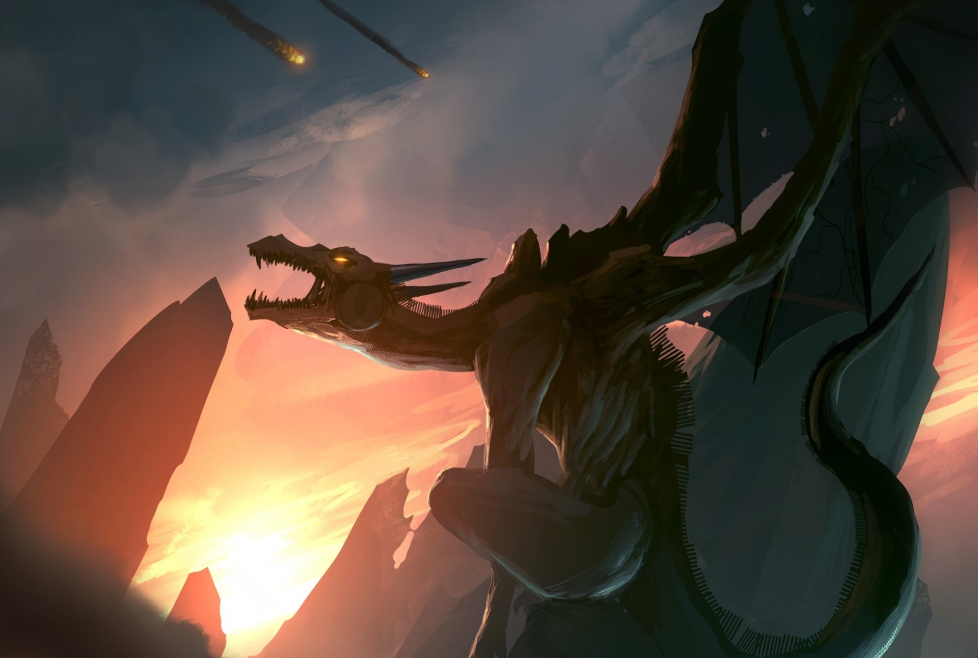 Mage sur le champ de bataille avec le dragon et les guerriers sur le terrainMage sur le champ de bataille avec le dragon et les guerriers sur le terrain