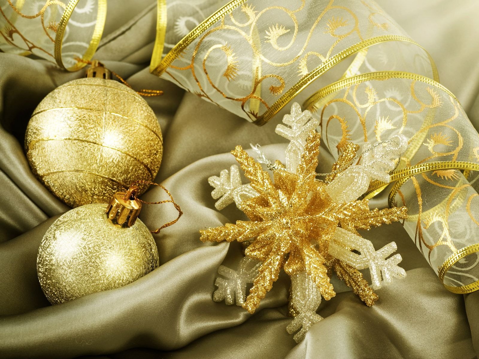 Boules de noël de couleur dorée avec flocon de neige et arcBoules de Noël de couleur dorée avec flocon de neige et arc