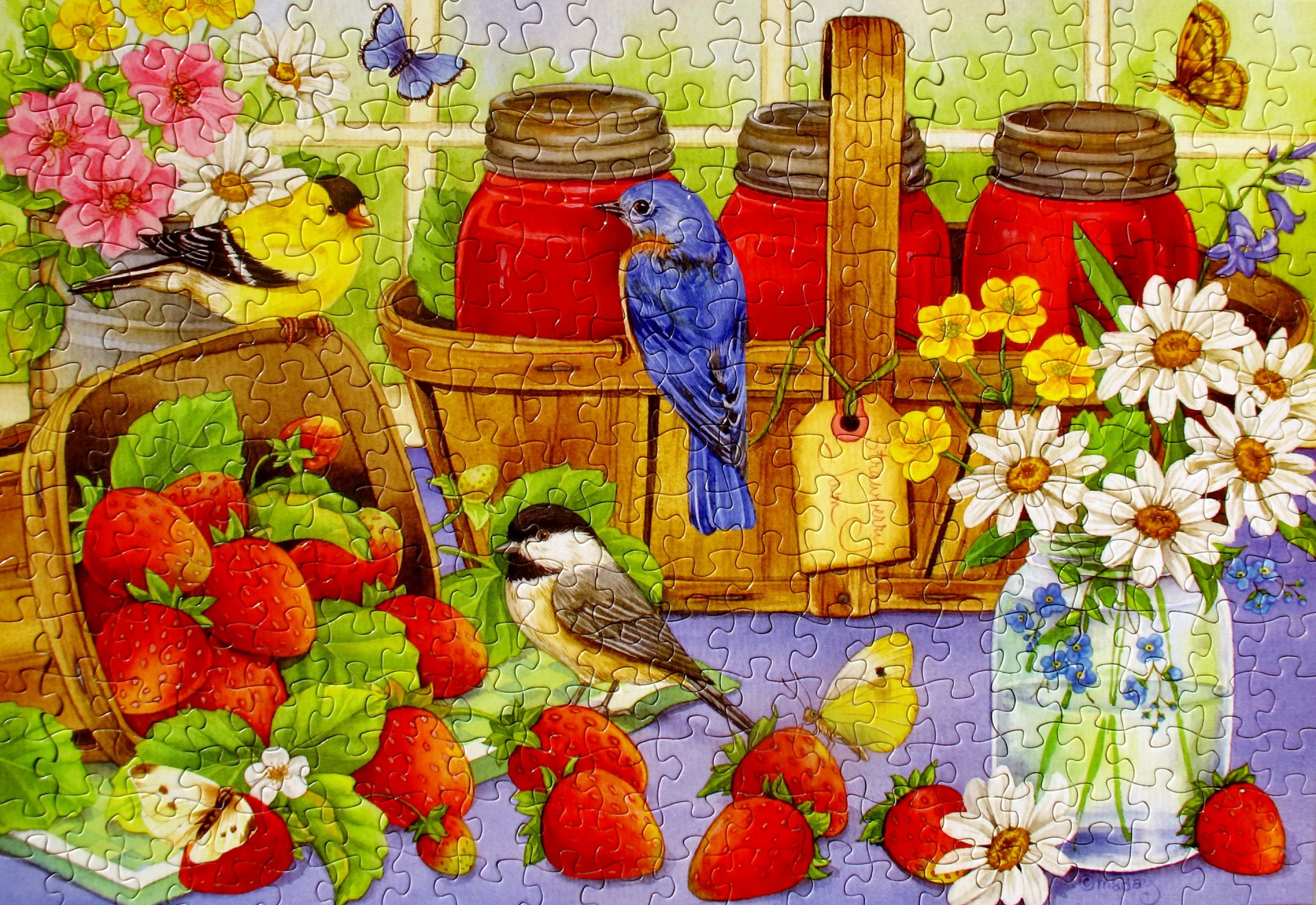 Belle image avec des fraises et des oiseaux