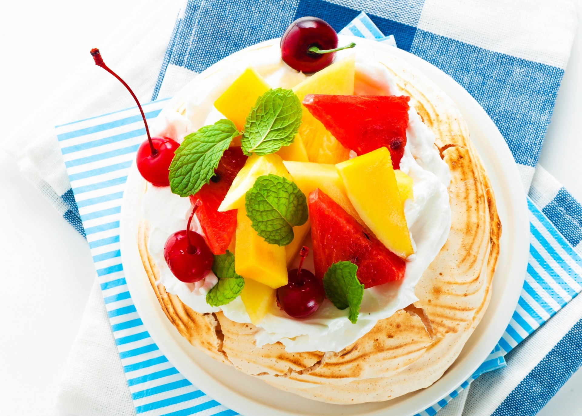Dessert avec des tranches de fruits sur fond blancDessert avec des tranches de fruits sur fond blanc