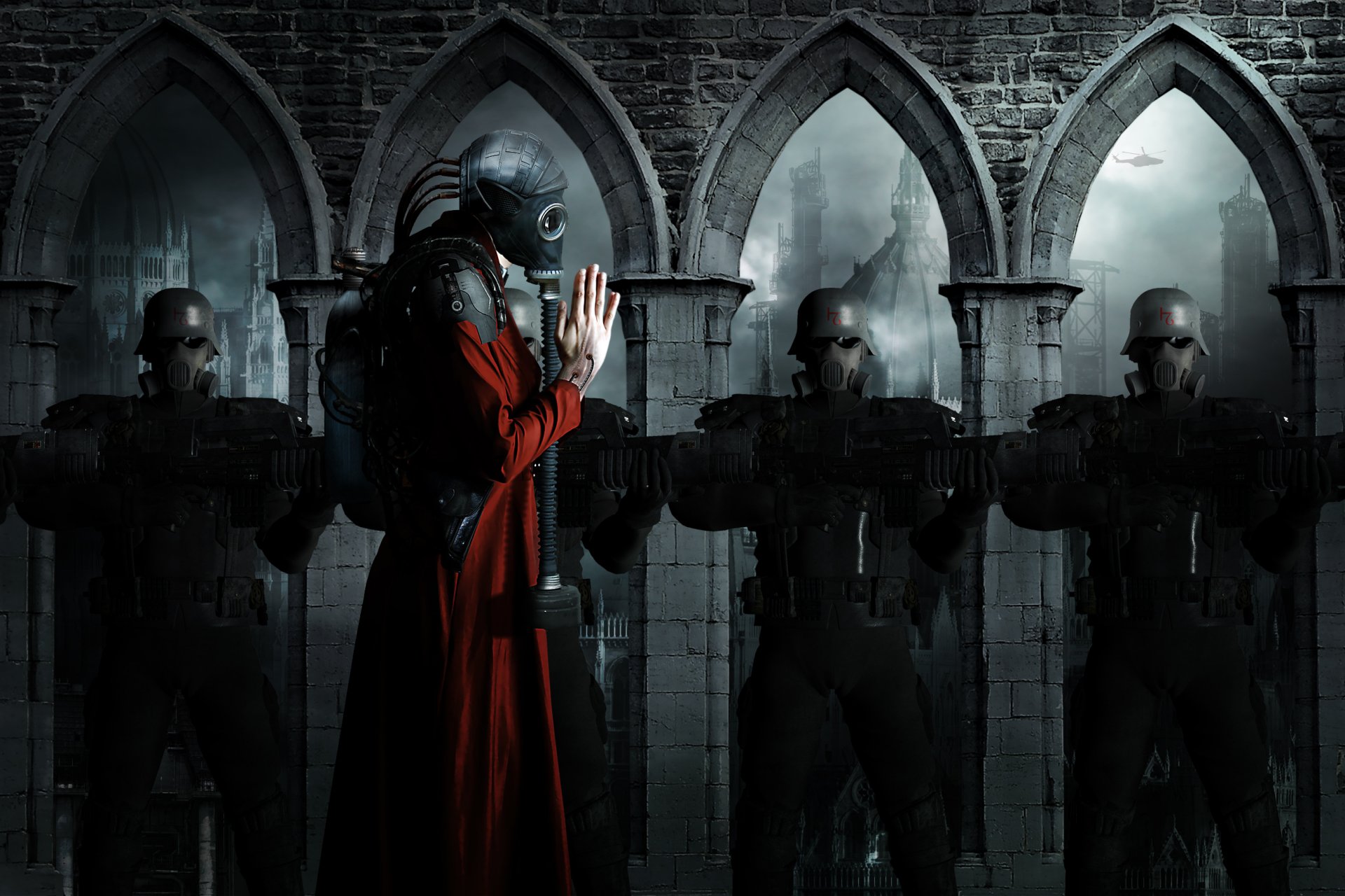 Paysage post-apocalyptique avec des gratte-ciel, la mer et la créature dans le bateauPaysage post-apocalyptique avec des gratte-ciel, la mer et la créature dans le bateau
