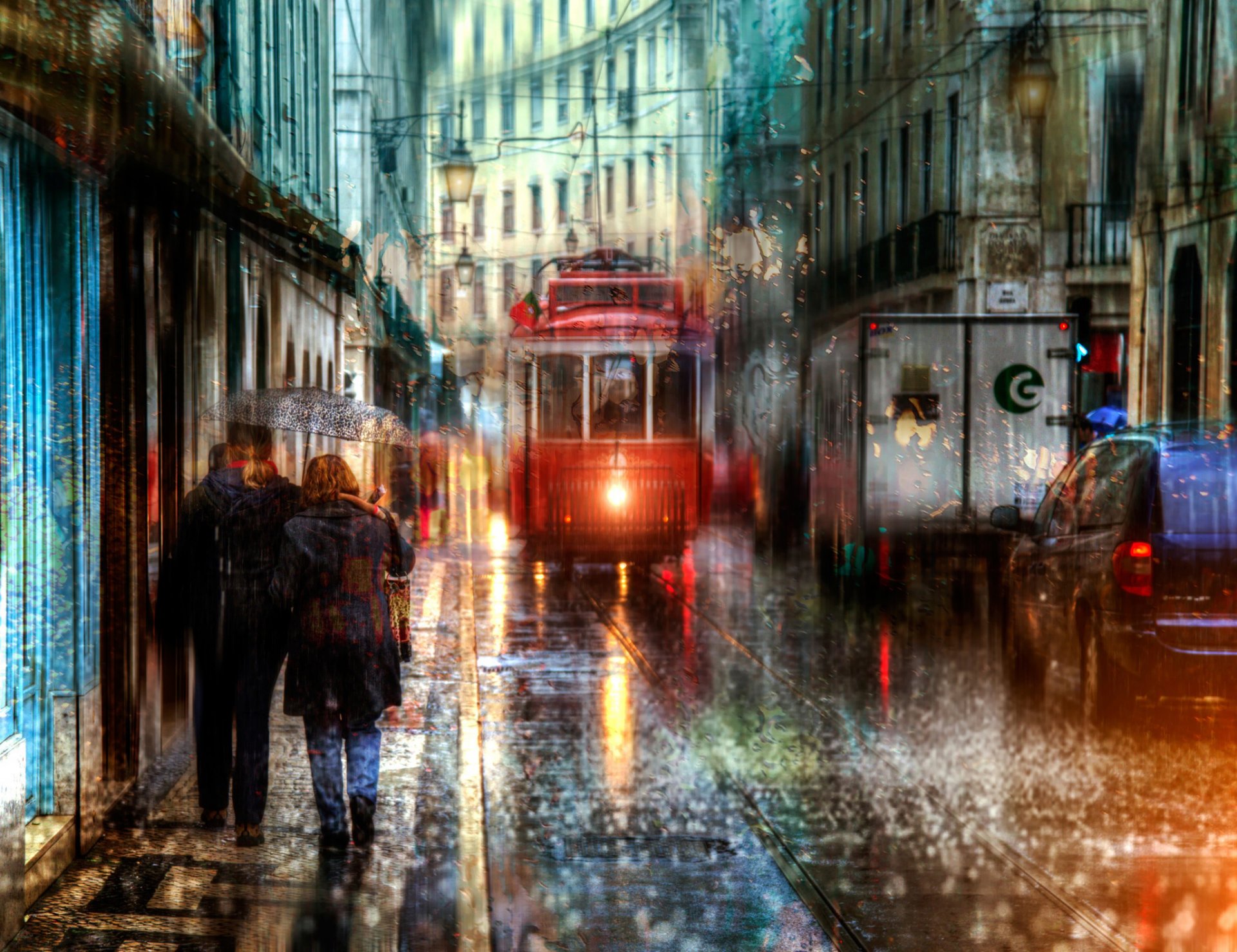 Palais noyé dans la verdure sur fond de ciel coucher de soleil bleu et rose