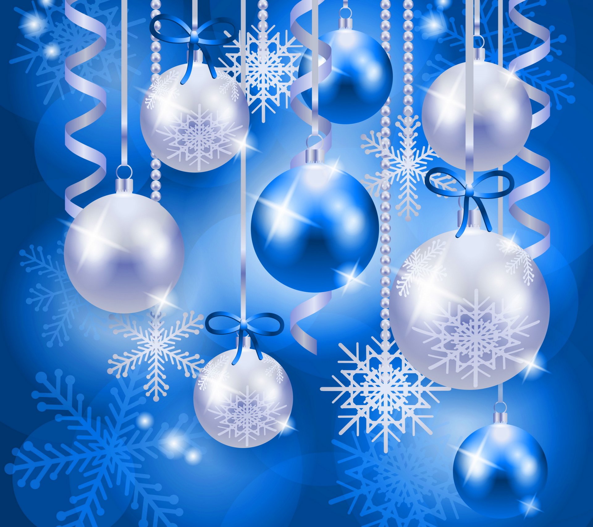 Boules bleues et argentées sur fond bleu avec des flocons de neige