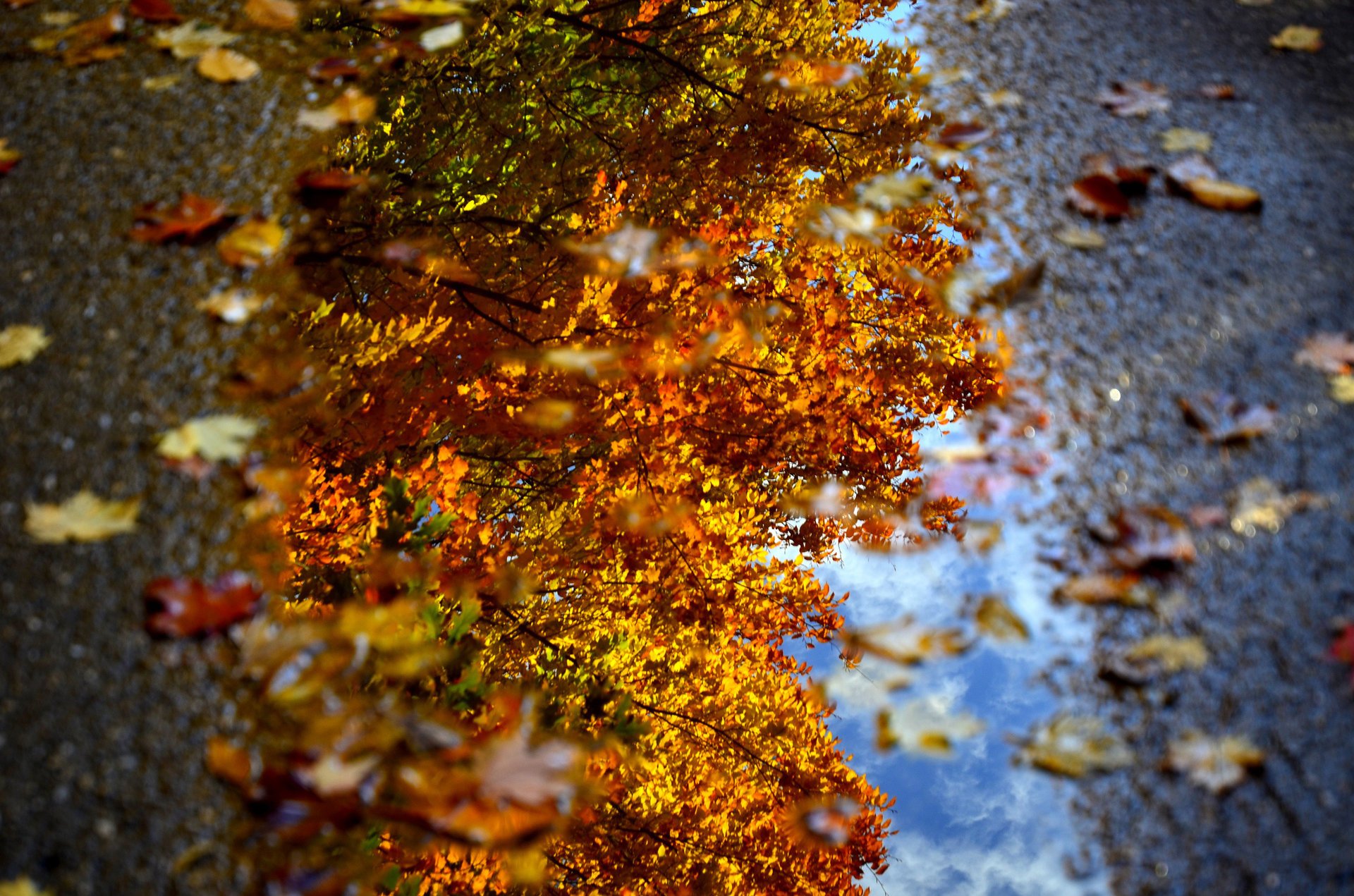 Image de gros plan, feuillage d'automne dans une flaque d'eauImage de gros plan, feuillage d'automne dans une flaque d'eau