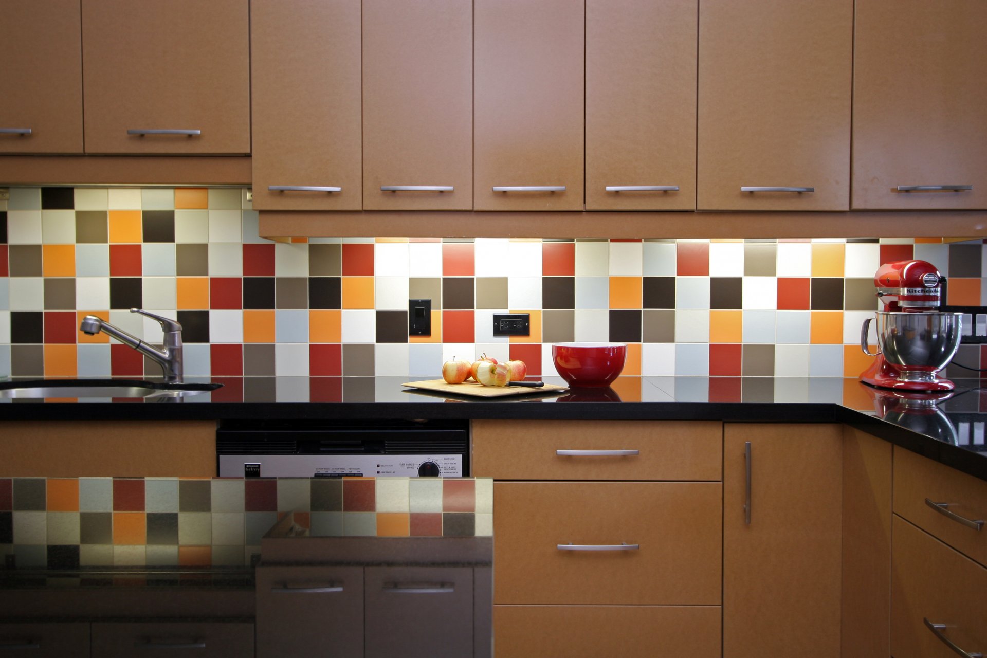 Cuisine lumineuse avec des ustensiles colorés et des Carreaux colorés sur le mur