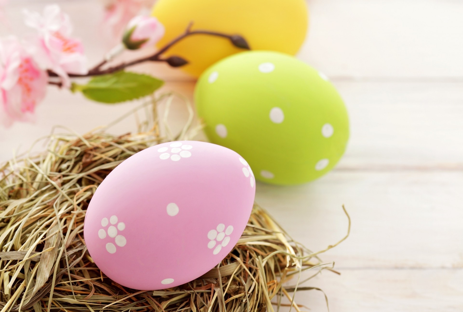 Oeufs de Pâques multicolores sur paille. Branche avec des fleurs