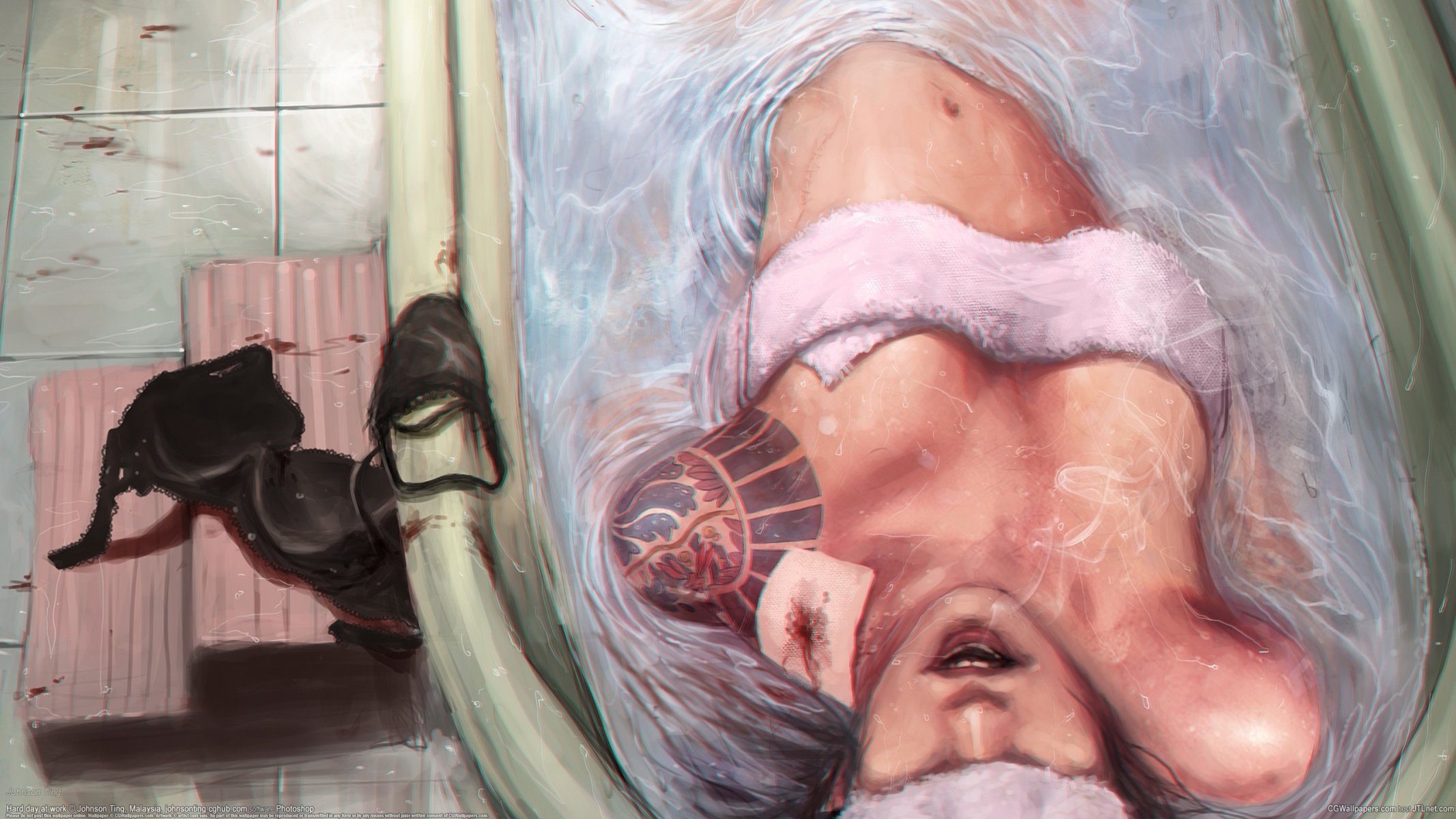 Photo d'une jeune fille avec une plaie dans la baignoire, soutien-gorge noir à côtéPhoto d'une jeune fille avec une plaie dans la baignoire, soutien-gorge noir à côté