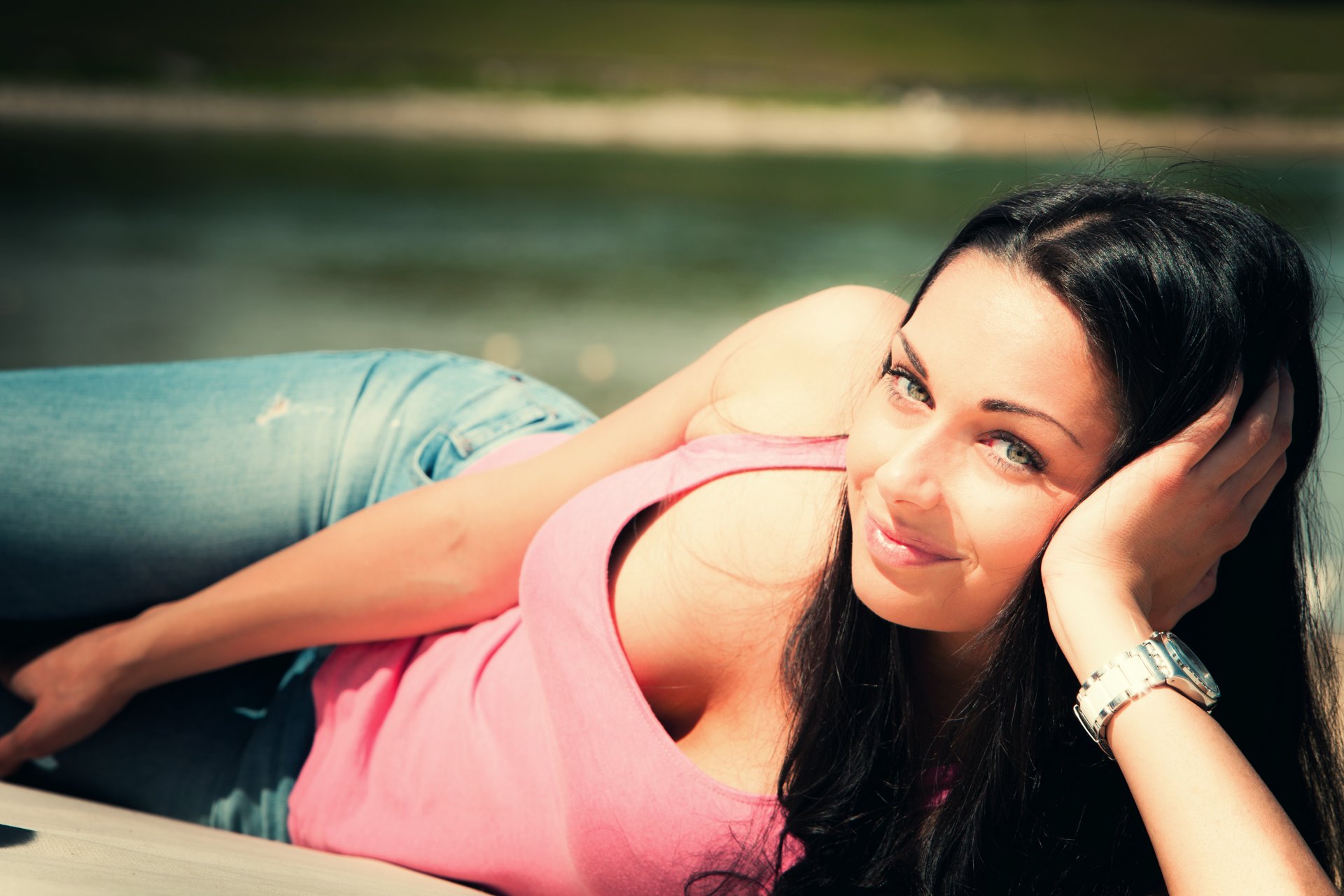 La jeune fille est allongée sur le côté dans un jean bleu et un t-shirt roseLa jeune fille est allongée sur le côté dans un Jean bleu et un t-shirt rose