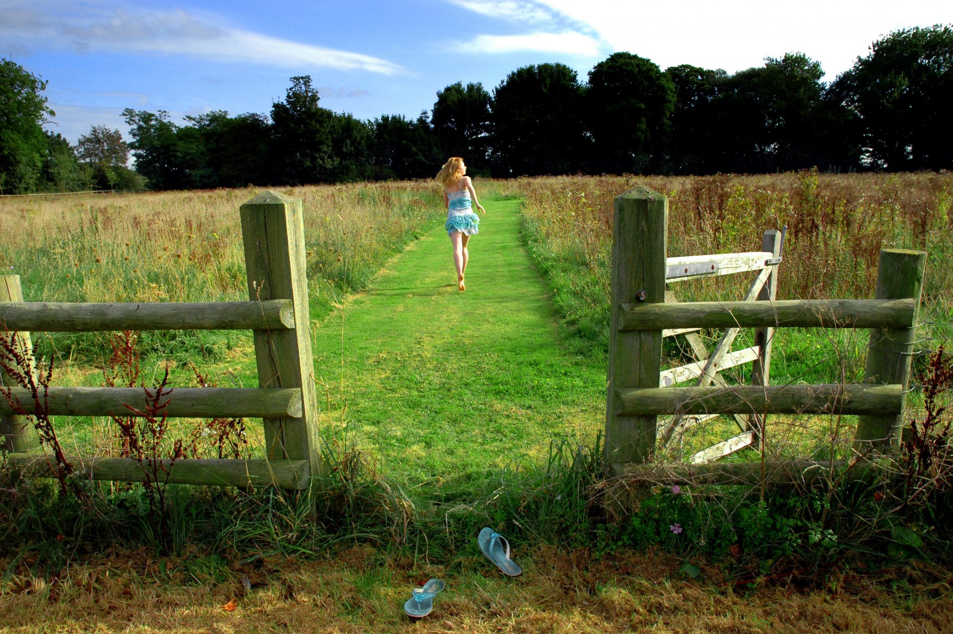 Tapis de course de la jeune fille dans un champ, et une clôture en bois