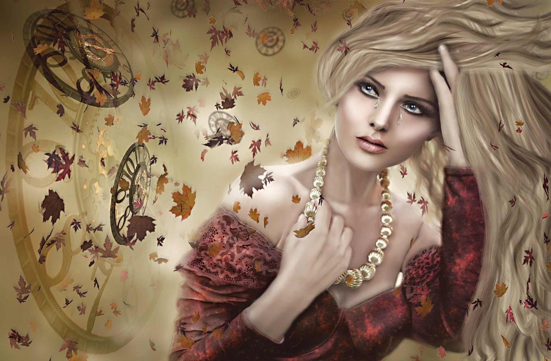 Pleurant jeune fille blonde sur le fond des heures et des feuilles