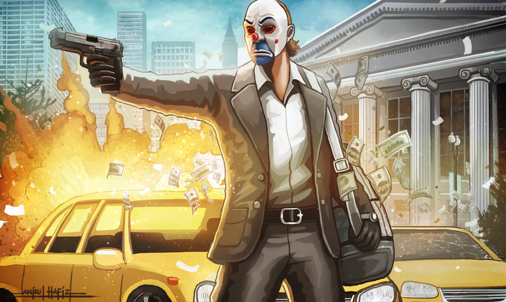 Joker avec un pistolet à la main sur le fond d'une voiture jaune en feuJoker avec un pistolet à la main sur le fond d'une voiture jaune en feu