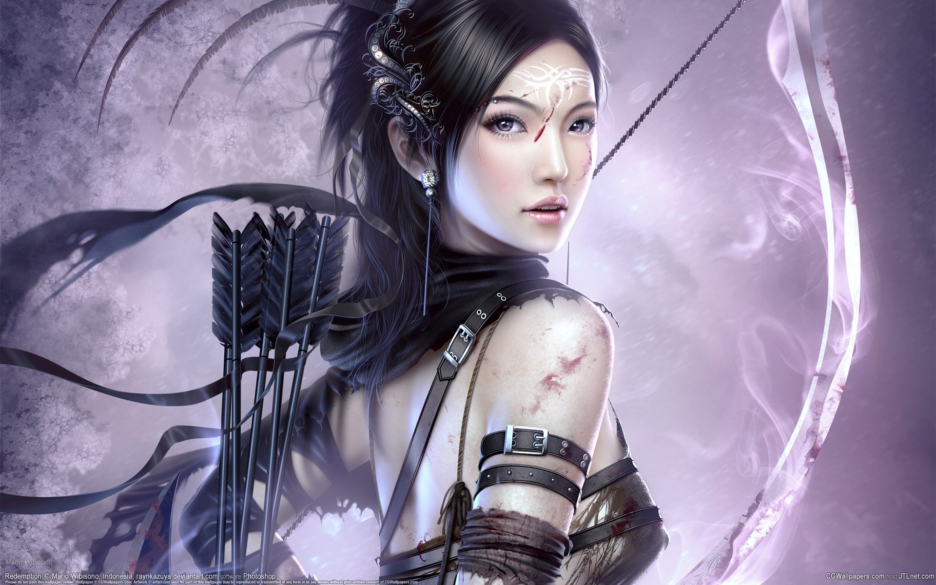 Fille avec des cornes tenant un arc de chasse et un aigle dans ses mainsFille avec des cornes tenant un arc de chasse et un aigle dans ses mains